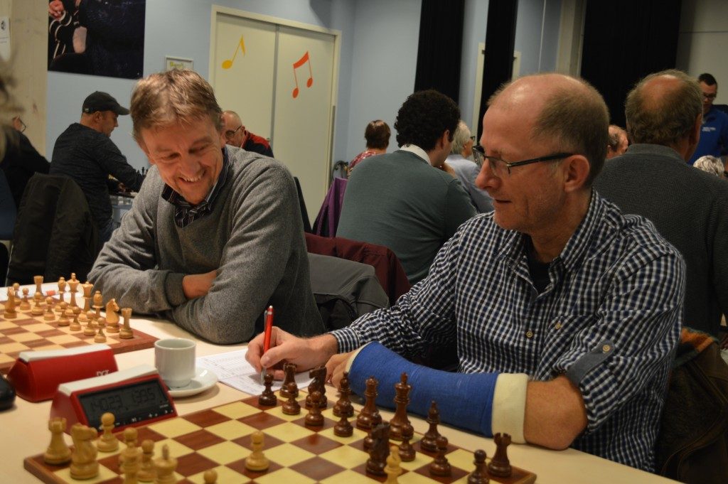 Frans Kragten kijkt met bewondering naar Bert Spil die een zet doet, noteert en koffie drinkt; allemaal met één arm.