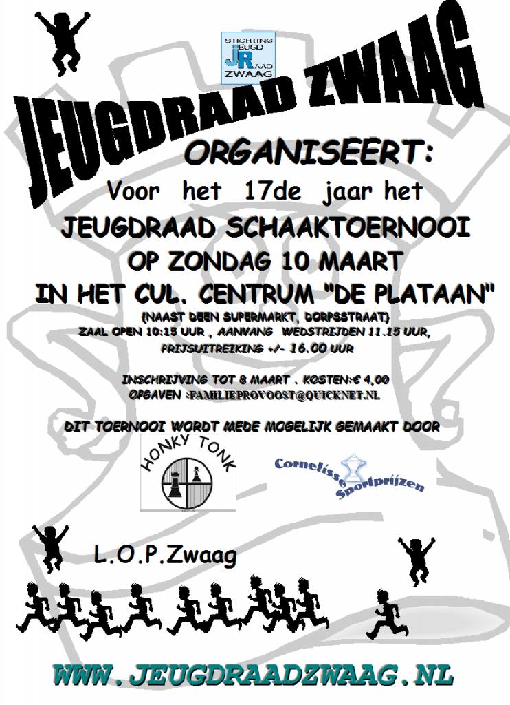 Zondag 10 maart: JeugdRaad Zwaag schaaktoernooi Geplaatst op 10 februari 2013 (0:22) door Robbert van Dijkhuizen Op zondag 10 maart aanstaande staat het JeugdRaad Zwaag toernooi (Honky Tonk) op het programma. Een altijd gezellig en leuk jeugdtoernooi voor schakers tot 16 jaar in het cultureel centrum de Plataan in Zwaag. Klik verder voor de aankondiging.