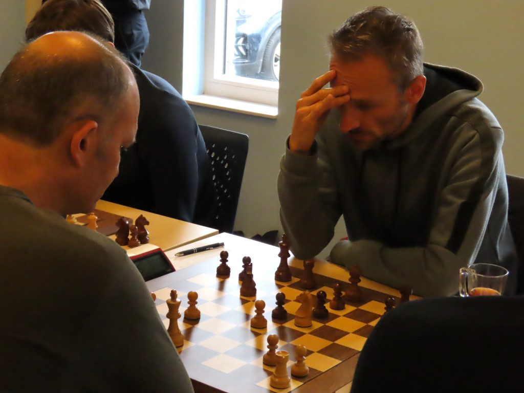 Terwijl Collin Boelhouwer andere stellingen bekijkt, hoeft Mark van Ojik niet lang na te denken. Zijn onverdedigd paard op c5 wordt door de zwarte dame op a5 aangevallen.