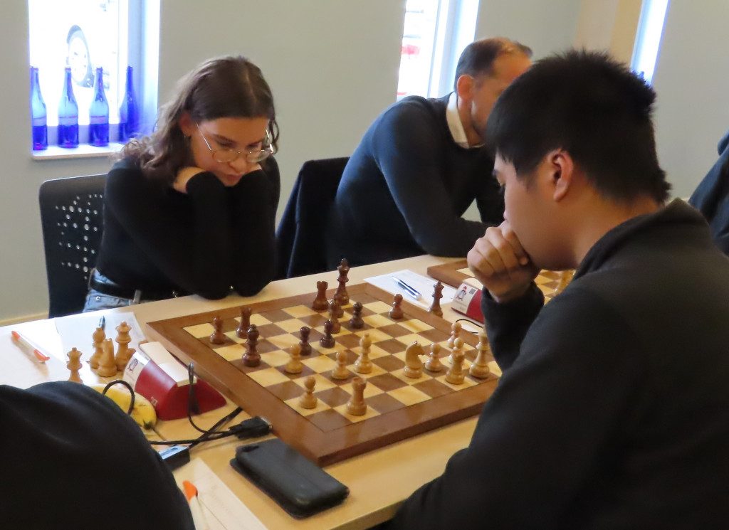 Voor Robin Duson is Chenwu Zhu geen onbekende. In datzelfde voorjaar van 2022 stond ook de wedstrijd HWP 2 – Caïssa-Eenhoorn 2 op het programma en bemanden beiden het tweede bord. De Hoornse speelster zegevierde, net als de naast haar zittende kopman Ardjan Langedijk en invaller Bert Spil. Het Haarlemse achttal won overigens wel, met 5-3. Weer met zwart hoopt Robin op herhaling te gaan, maar het voormalige Hoofddorp-talent geeft geen krimp. Van begin tot einde zit er evenwicht in de partij. Wit dwingt via dameruil op f6 een dubbelpion af, maar de Caïssa-Eenhoornse heeft het initiatief en is vooral op de damevleugel actief. Ze probeert met haar torens via de c-lijn toe te slaan. Na torenruil krijgt ook Chenwu een dubbelpion (op de b-lijn). De stelling biedt geen aanknopingspunten op meer dan een halfje en op de 29e zet kan de uitslag op het wedstrijdformulier.