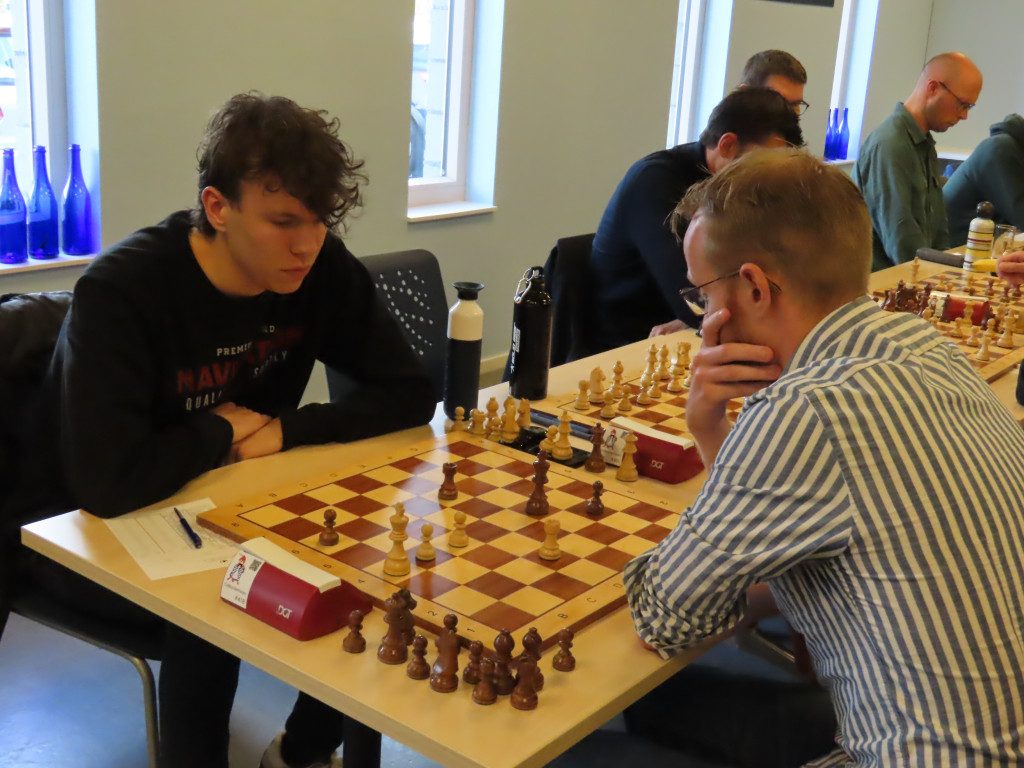 Mooi eindspel van David Verweij. De kopman van Caïssa-Eenhoorn 2 heeft een verre vrijpion, maar hij moet ook de verbonden pionnen van Jelle Bulthuis tegenhouden.