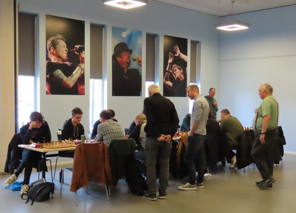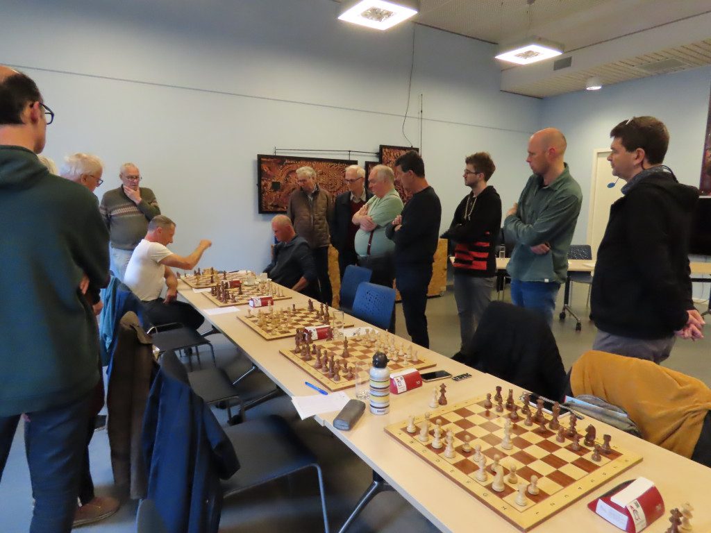 Hoewel de wedstrijd is beslist (de thuisploeg leidt met 6½-½), is er veel belangstelling voor de ontknoping van de partij Ardjan Langedijk – Tony Goudriaan. De witspeler is bezig een zet uit te voeren.