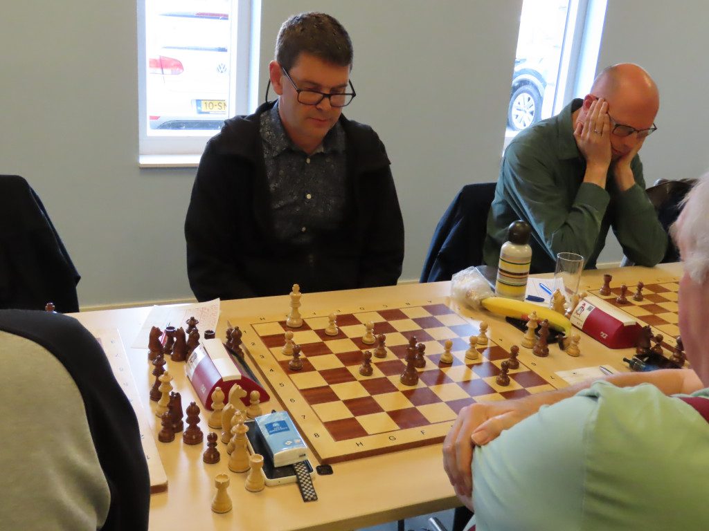 Na een rustige start op de meeste borden zag het er vanuit de opening wel al meteen goed uit op bord 2. Abel Romkes creëerde al snel een zwakte in de zwarte stelling en kon na een slecht getimed f5 van zwartspeler Hans Hulshof met een tussenzet een pion winnen: