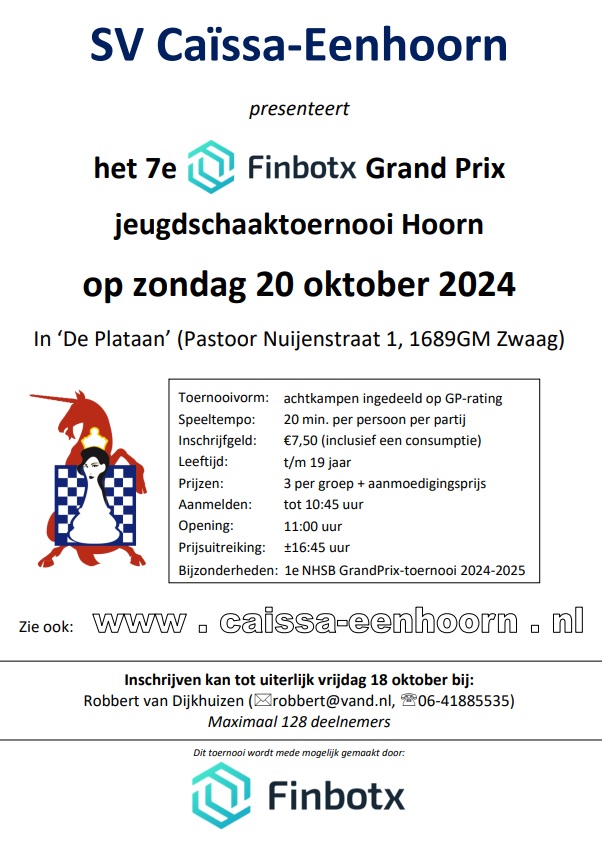 Net als een jaar geleden trekt de Finbotx GP meer dan honderd deelnemers. Maar toch is het jeugdtoernooi van Caïssa-Eenhoorn ditmaal net even iets anders. Het evenement in het Zwaagse cultureel centrum De Plataan heeft een internationaal tintje, er zijn twee Nederlandse kampioenen, de organisatie hanteert een nieuwe ratinglijst en als klap op de vuurpijl: er wordt een gouden KNSB-speld uitgereikt. Voor zijn indrukwekkende staat van dienst bij met name het jeugdschaken krijgt Gilles Provoost, erelid van Caïssa-Eenhoorn, het kleinood.