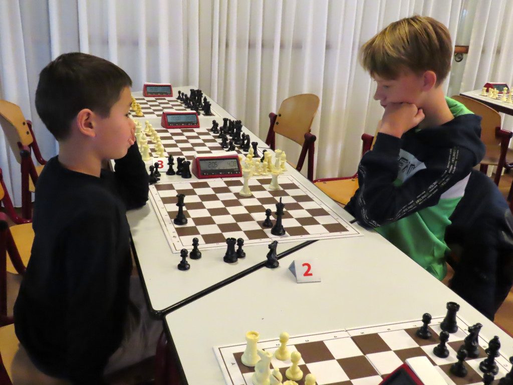 Sven Winter, deelnemer met de hoogste rating, tijdens zijn derderondepartij tegen Noah Sosef, Nederlands kampioen bij de jeugd tot en met 9 jaar.