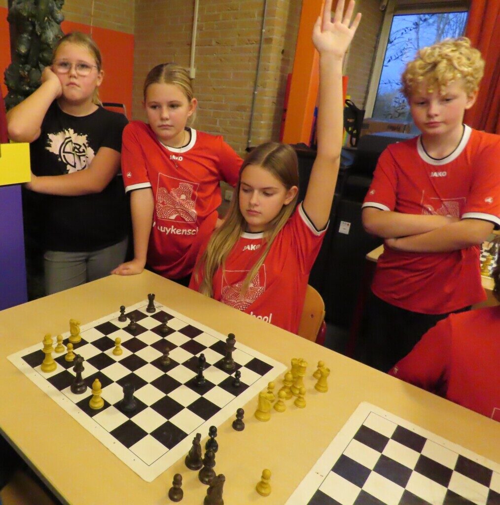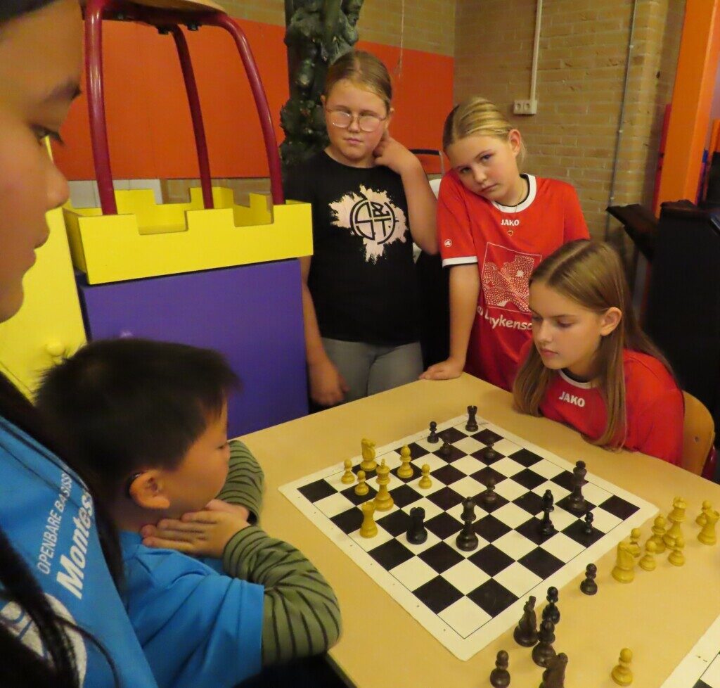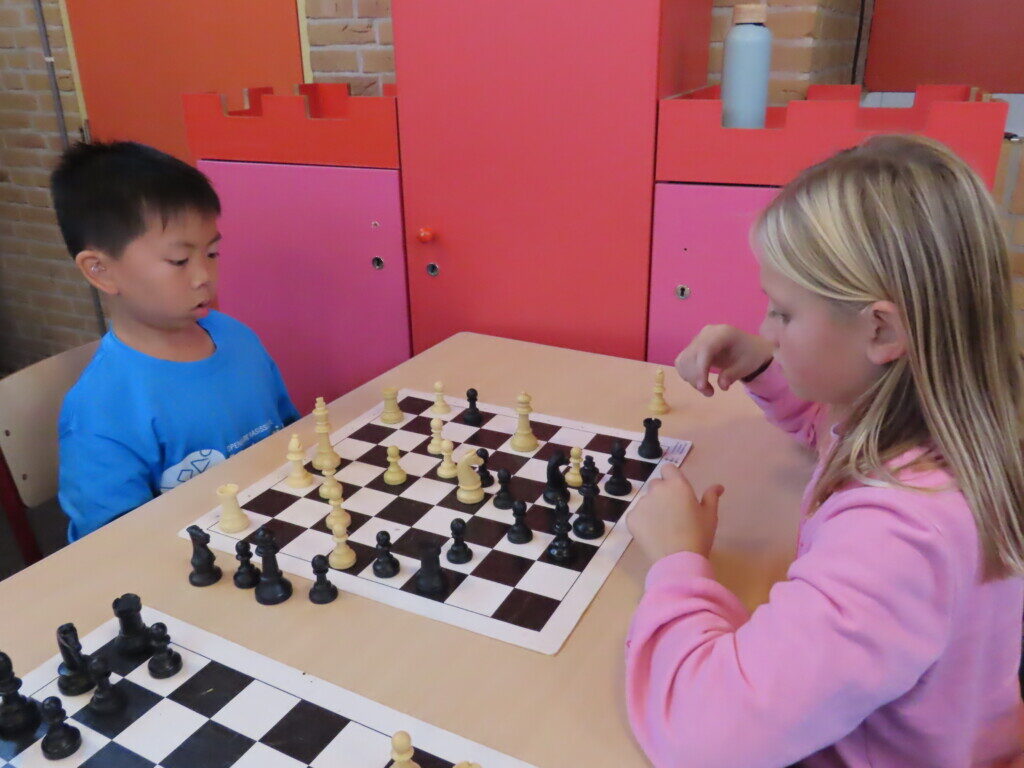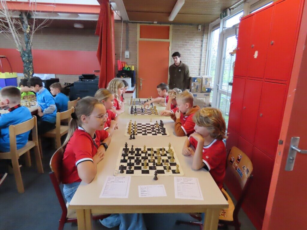 In groep I spelen in de eerste ronde de twee ploegen van de Jan Luykenschool tegen elkaar. Robin doet het in het derde team heel goed. Zij schaakt nog maar een paar weken en het lukt haar in twee partijen om de opponent mat te zetten. Beide keren gebeurt dat na een lange strijd, terwijl in de loop van de middag op menig bord al heel snel een bekend matpatroon te zien is: van de dame, verdedigd door een loper.
