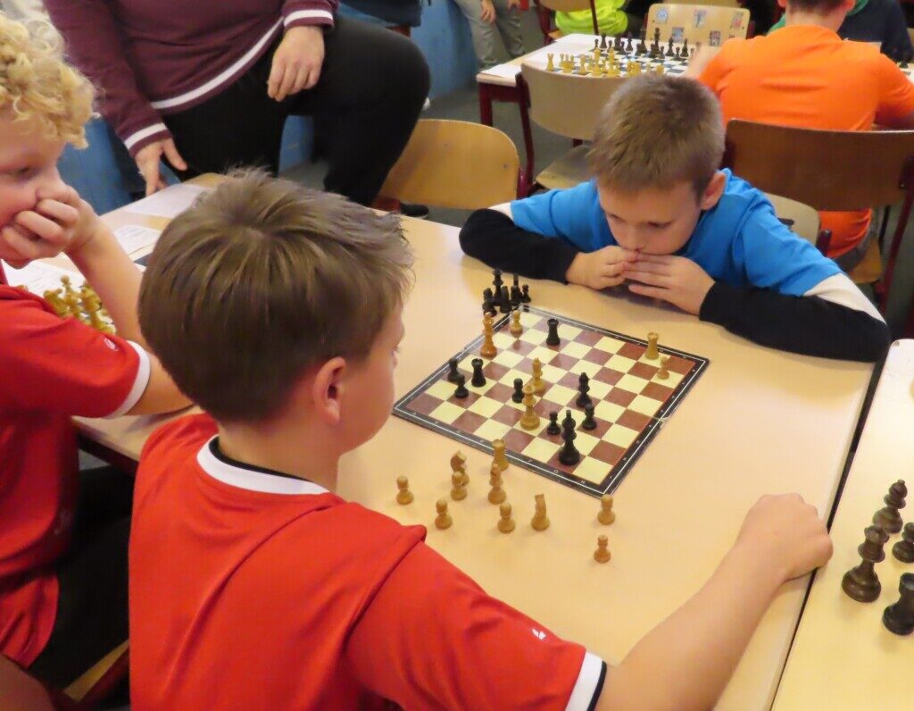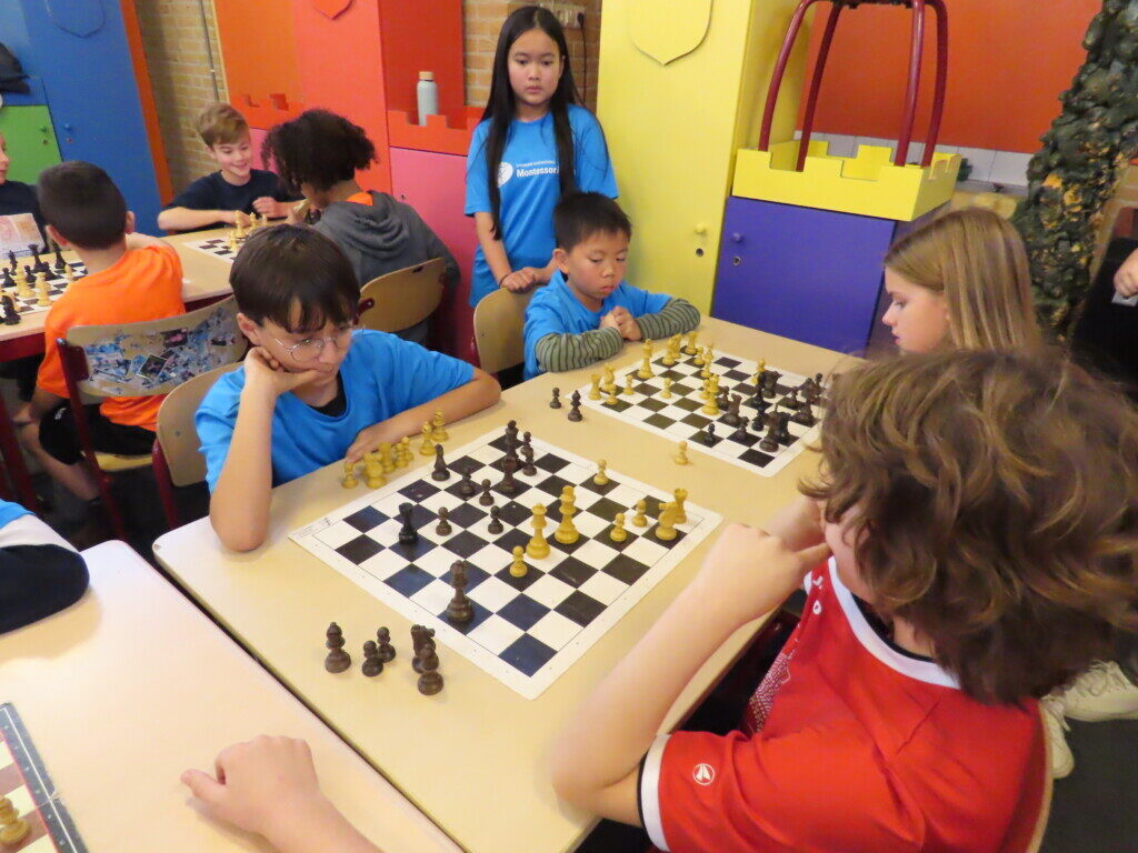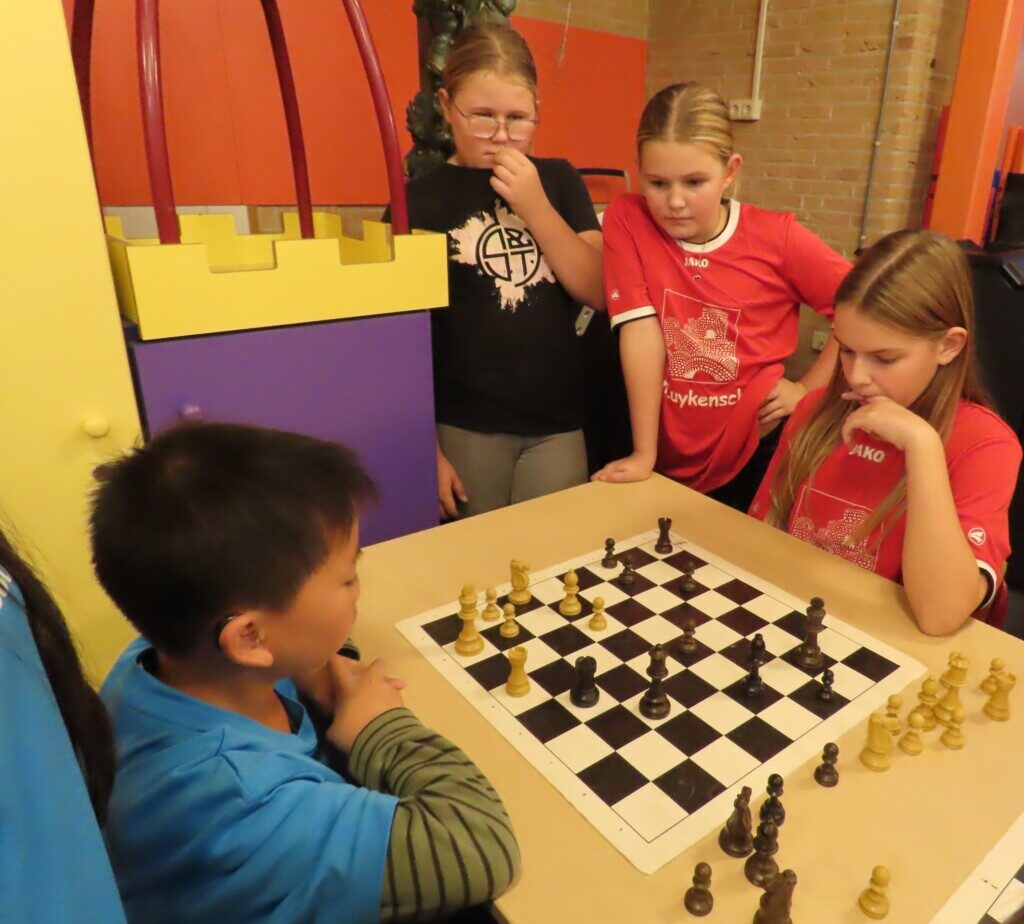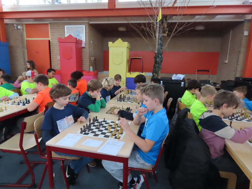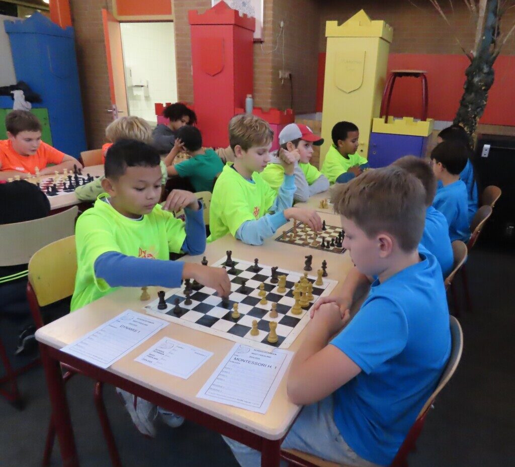 Synchroonschaak op de borden 1 en 2 van Dynamis. De Hoornse ploeg speelt in de vierde ronde van groep D tegen de Montessorischool.