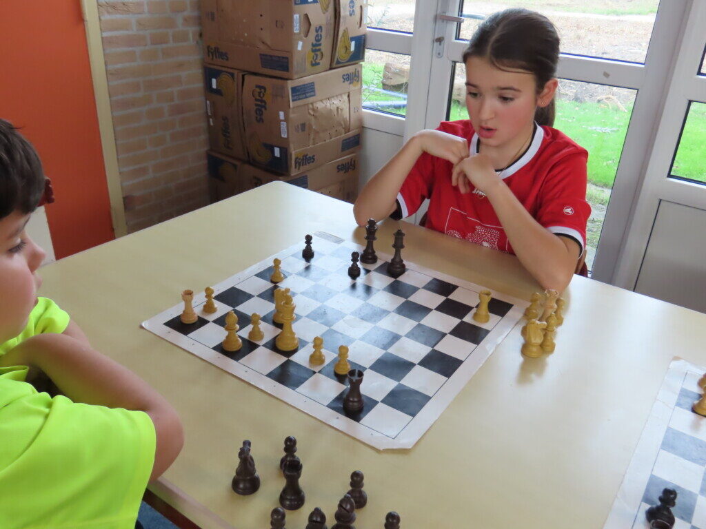 ,,De witte koning kan nergens naar toe’’, beseft Robin. Ze wint een van haar twee partijen met mat.