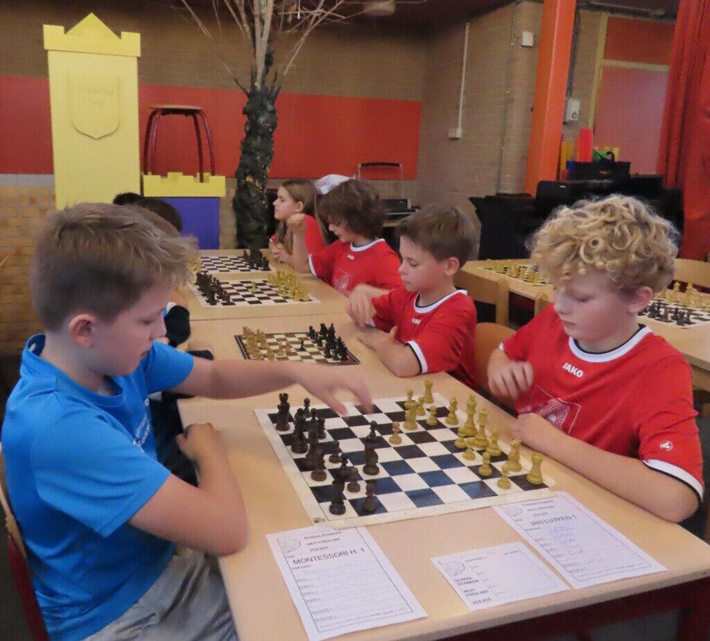 Een echte finale in de vijfde en laatste ronde. De Jan Luykenschool (rechts) neemt het op tegen de Montessorischool, de nummers 1 en 2 van de ranglijst.