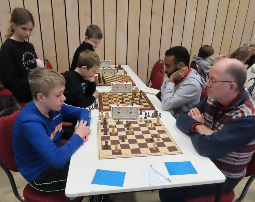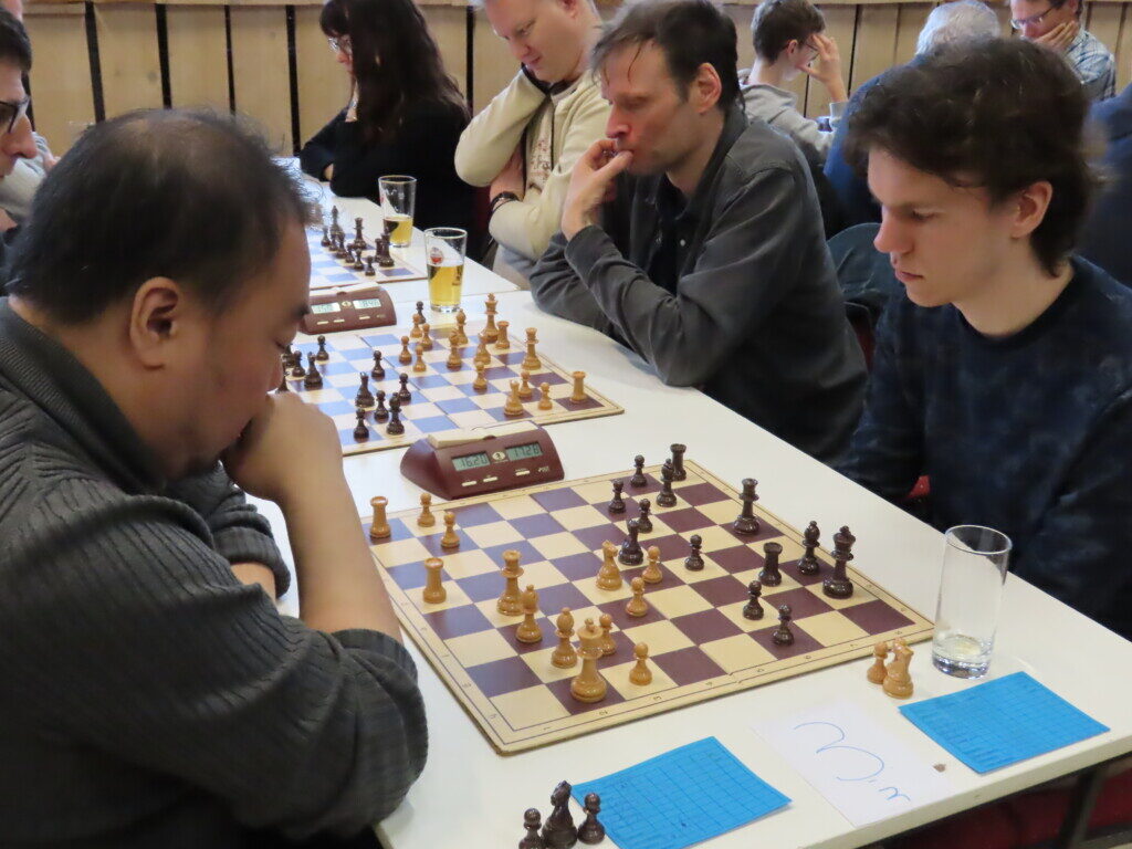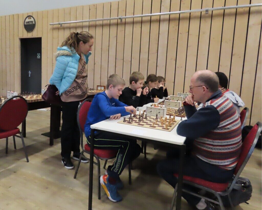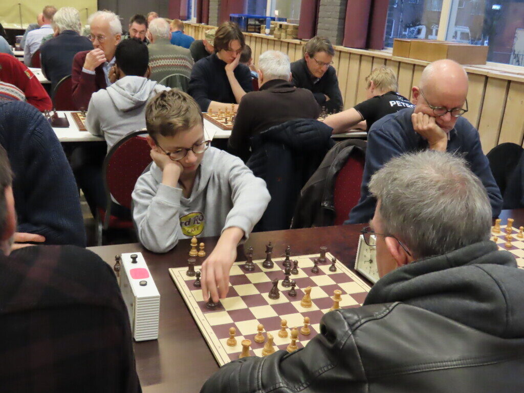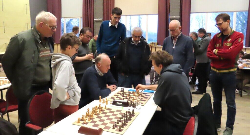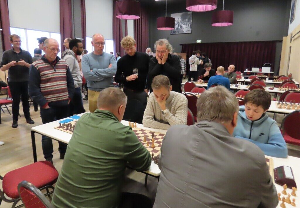 Daan Zult brengt zijn loper naar h4 in de partij tegen de sterke spelende Jos Broersen. Zijn broer Gerard Broersen (tweede van rechts) bevindt zich onder de toeschouwers.