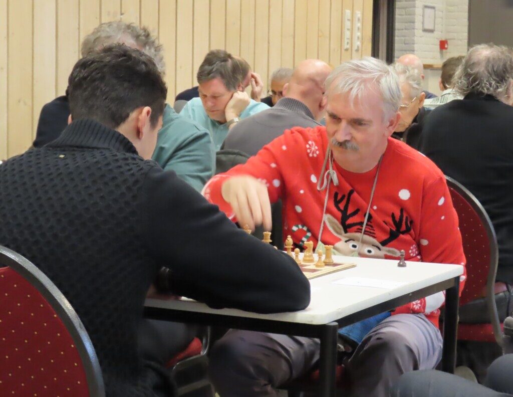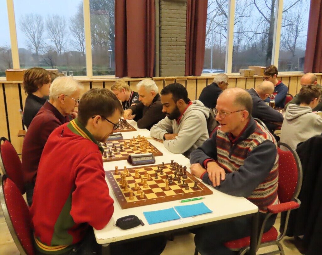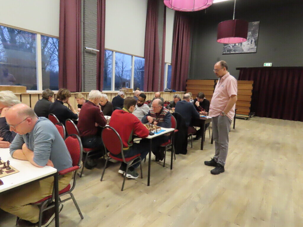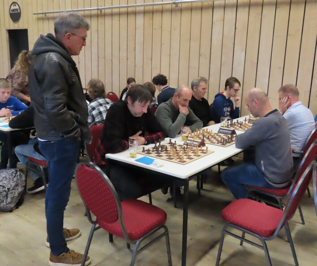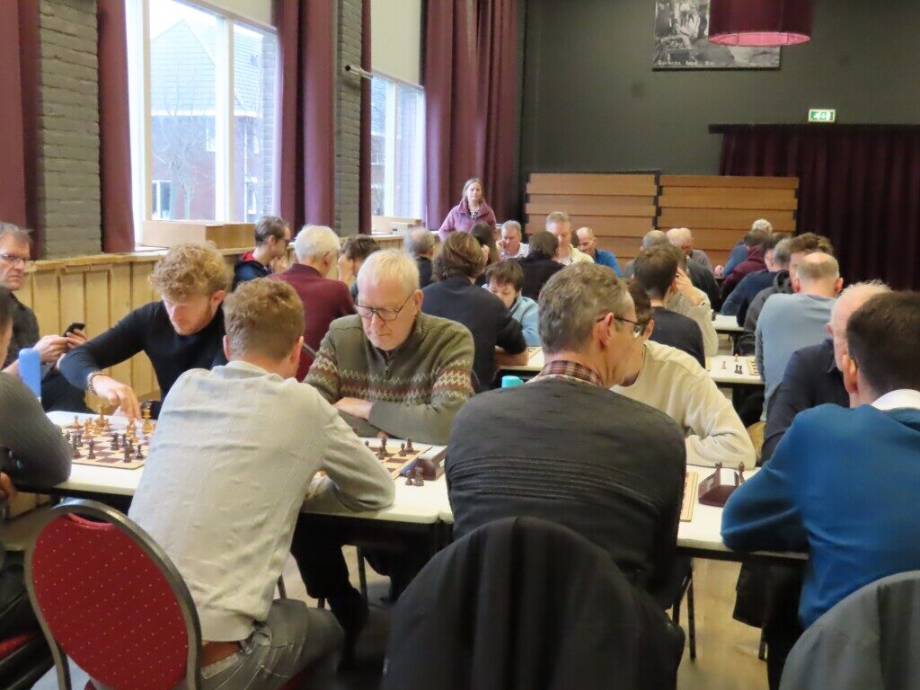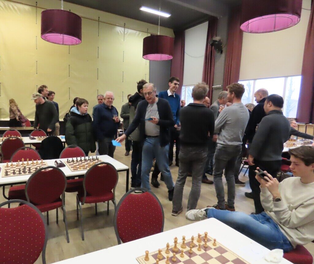 Met zestien ploegen, die zo’n zeventig schakers op de been brachten, was het traditionele eindejaarstoernooi goed bezet. Voor de entreeprijs kregen de deelnemers een bon voor twee koppen koffie of thee, een kop soep en twee broodjes ham en/of kaas. ,,En voor kroket’’, haastte Cor Gorter (met René Brouwer, Dirk Mantel, Piet Reus en Nico Weel de mannen achter de schermen) in zijn openingswoord te vertellen, want dat stond niet op de bon. Die toevoeging werd met een groot applaus beloond. Na het middaguur liet hij weten dat door het voorspoedige verloop van het evenement er een extra ronde kon worden gespeeld (zeven in plaats van de geplande zes; speeltempo twintig minuten) en ook die mededeling waardeerde iedereen.