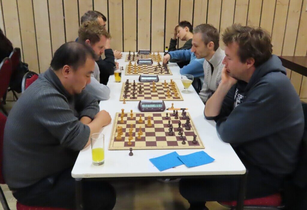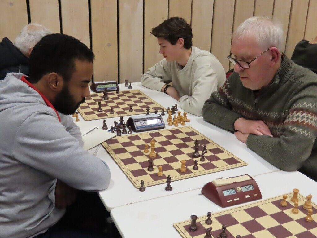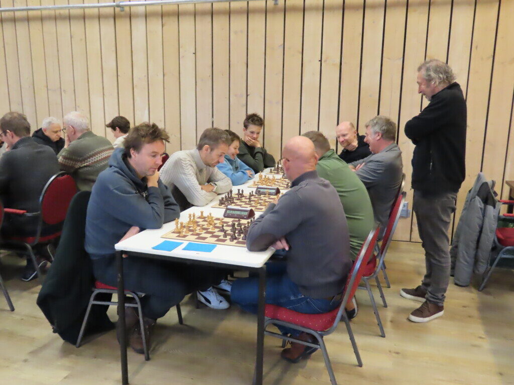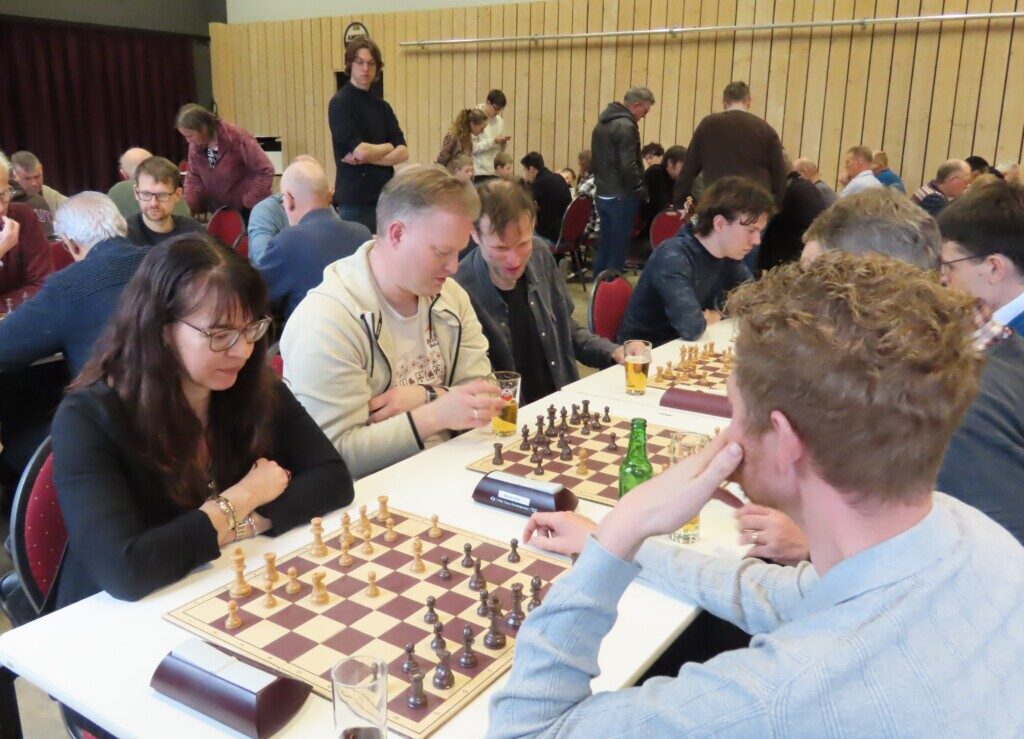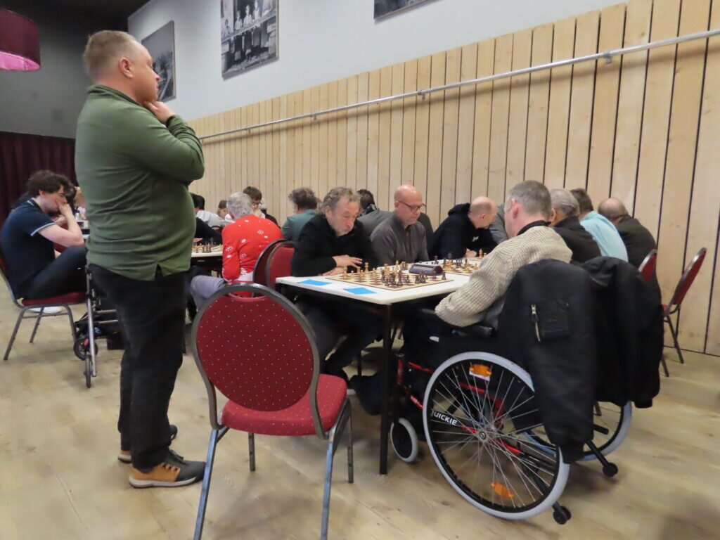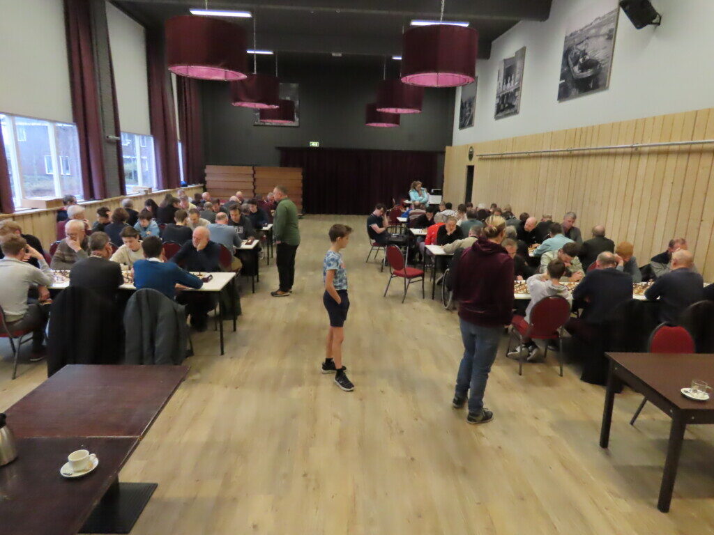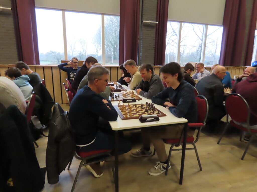 Met zestien ploegen, die zo’n zeventig schakers op de been brachten, was het traditionele eindejaarstoernooi goed bezet. Voor de entreeprijs kregen de deelnemers een bon voor twee koppen koffie of thee, een kop soep en twee broodjes ham en/of kaas. ,,En voor kroket’’, haastte Cor Gorter (met René Brouwer, Dirk Mantel, Piet Reus en Nico Weel de mannen achter de schermen) in zijn openingswoord te vertellen, want dat stond niet op de bon. Die toevoeging werd met een groot applaus beloond. Na het middaguur liet hij weten dat door het voorspoedige verloop van het evenement er een extra ronde kon worden gespeeld (zeven in plaats van de geplande zes; speeltempo twintig minuten) en ook die mededeling waardeerde iedereen.