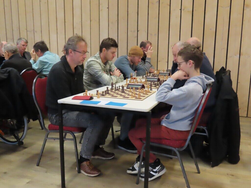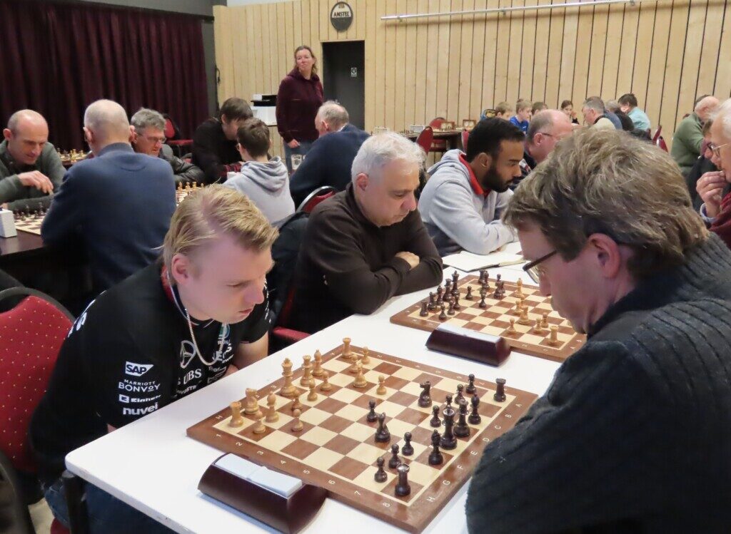 Billy Jeans Gambit – De Saense Skeuvers. Aan de hoogste borden zitten de Caïssa-Eenhoorn-toppers Daan Zult (links) en Peter Doggers.