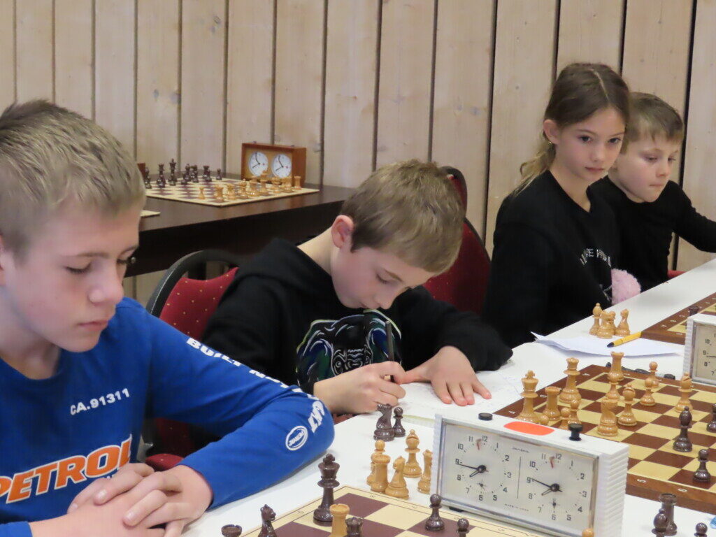 Het jeugdviertal van Castricum in actie tegen de Friemelaars in Andoik. Sjoerd Hoekstra voert op het eerste bord een zet uit tegen Bert Spil.