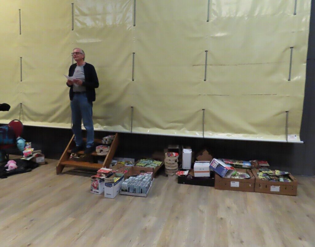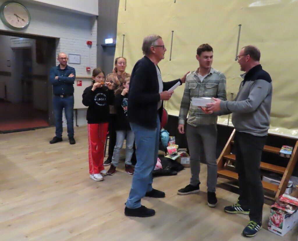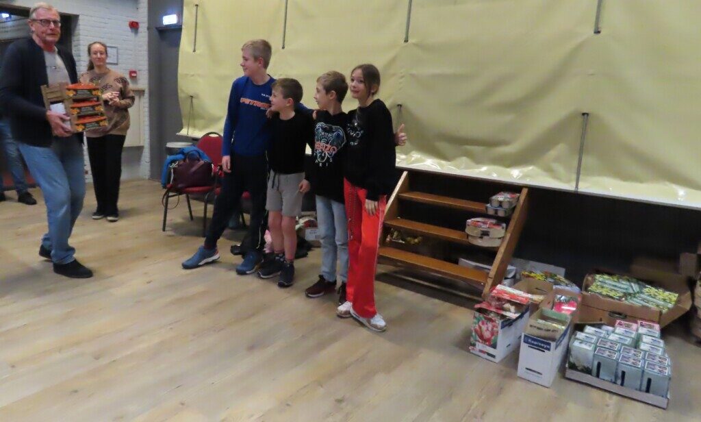 De prijsuitreiking gaat beginnen. Rechts op de grond liggen de zakken met bollen, als herinnering voor iedere deelnemer. Komend voorjaar is her en der in Noord-Hollandse tuinen te zien wie aan het rapidtoernooi van Schaaklust heeft meegedaan.
