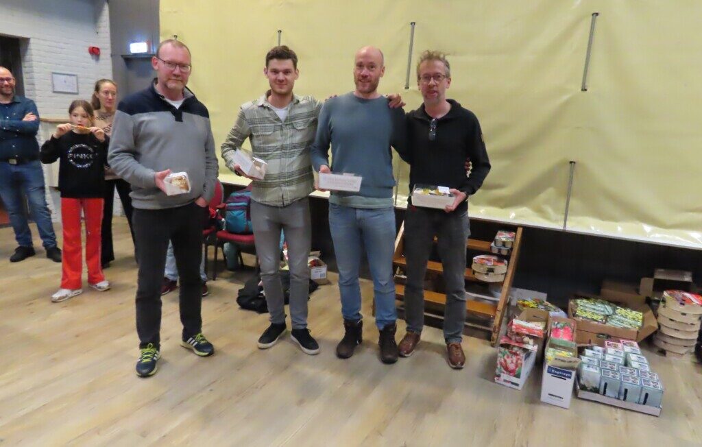 De Pircers van Buiten, winnaar van het eindejaarstoernooi 2024 van Schaaklust. Vlnr Bas Dudink (oud-Caïssa-Eenhoorn) en de Caïssa-Eenhoorn-spelers Nick Manshanden, Gilbert Vrancken en Mark van Ojik.