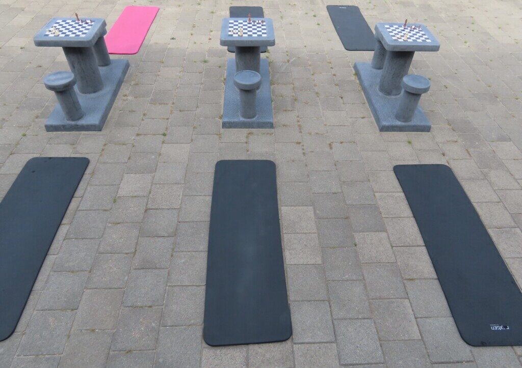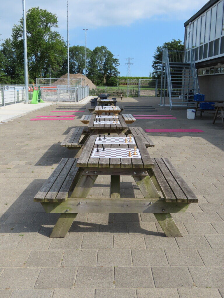 De drie schaaktafels bij HSV Sport. Met ligmatten voor de fitnessvormen tijdens het fitschaken.