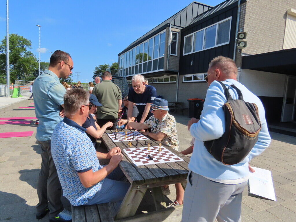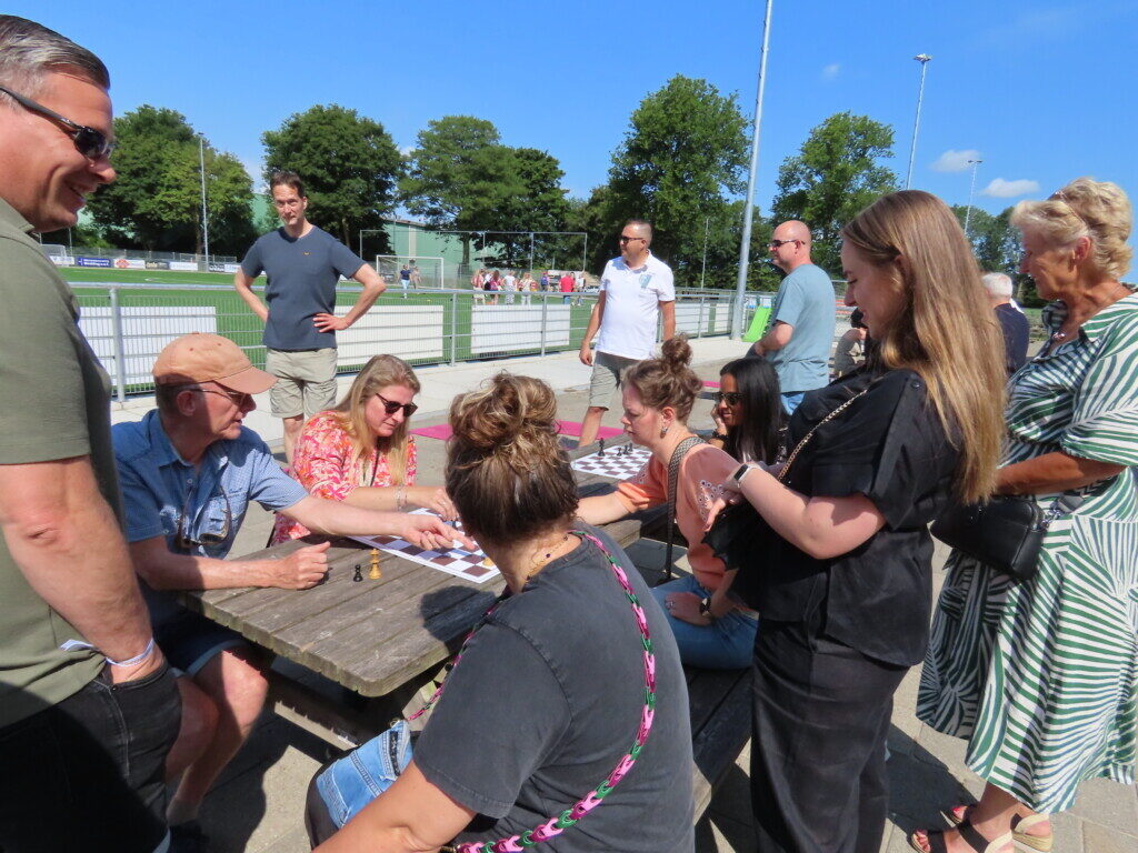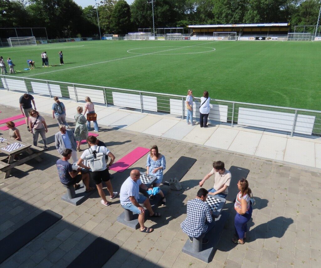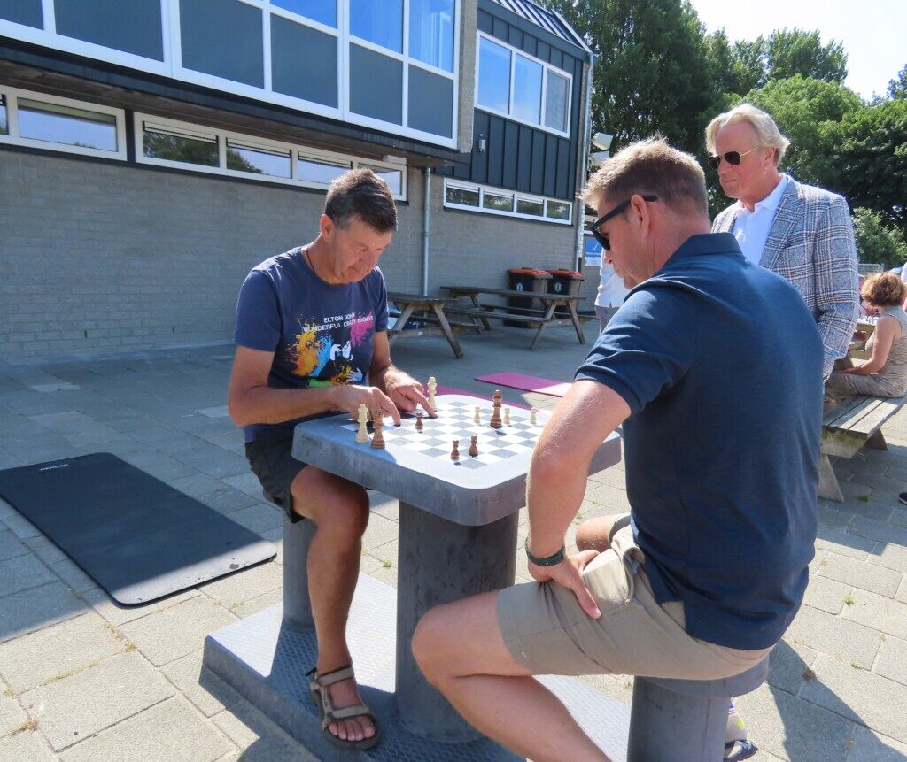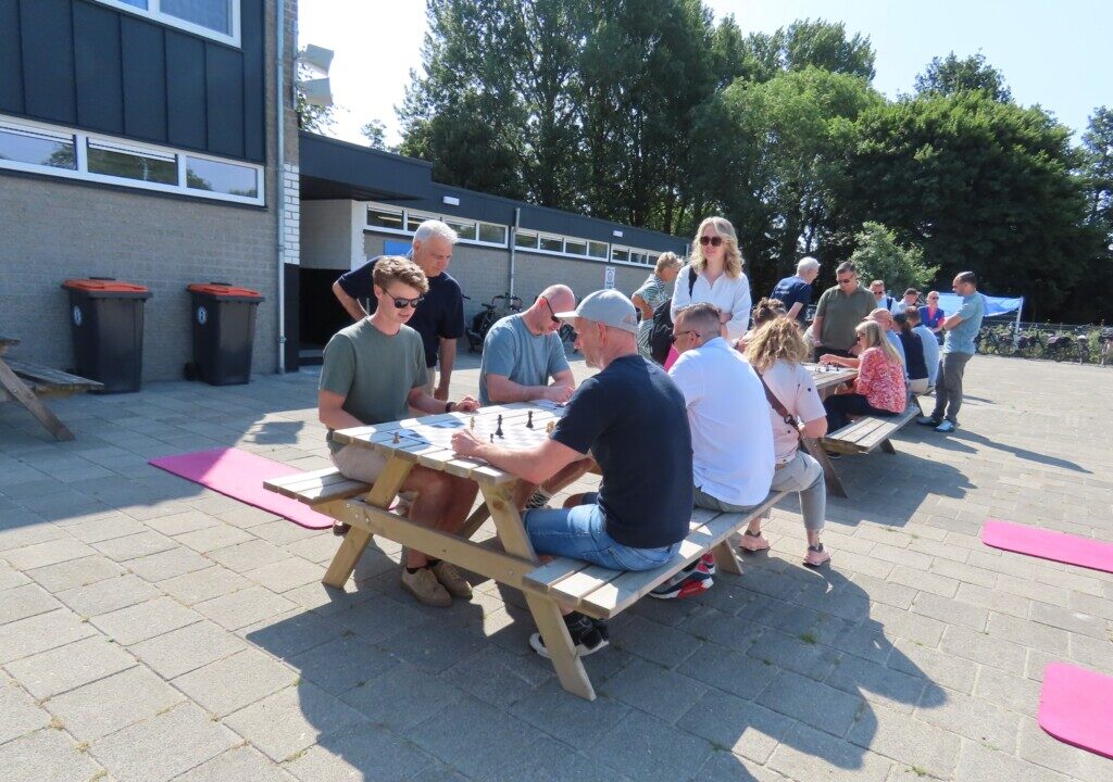 Medewerkers van de gemeente Hoorn waagden zich vandaag aan het schaakbord. Tussen het clubgebouw van HSV Sport en het hoofdveld van de voetbalvereniging staan drie schaaktafels, terwijl op vier houten picknicktafels acht schaakborden waren gezet. De vierde editie van Fietsival bracht zo’n vierhonderd mensen in beweging en een van de activiteiten was fitschaken.