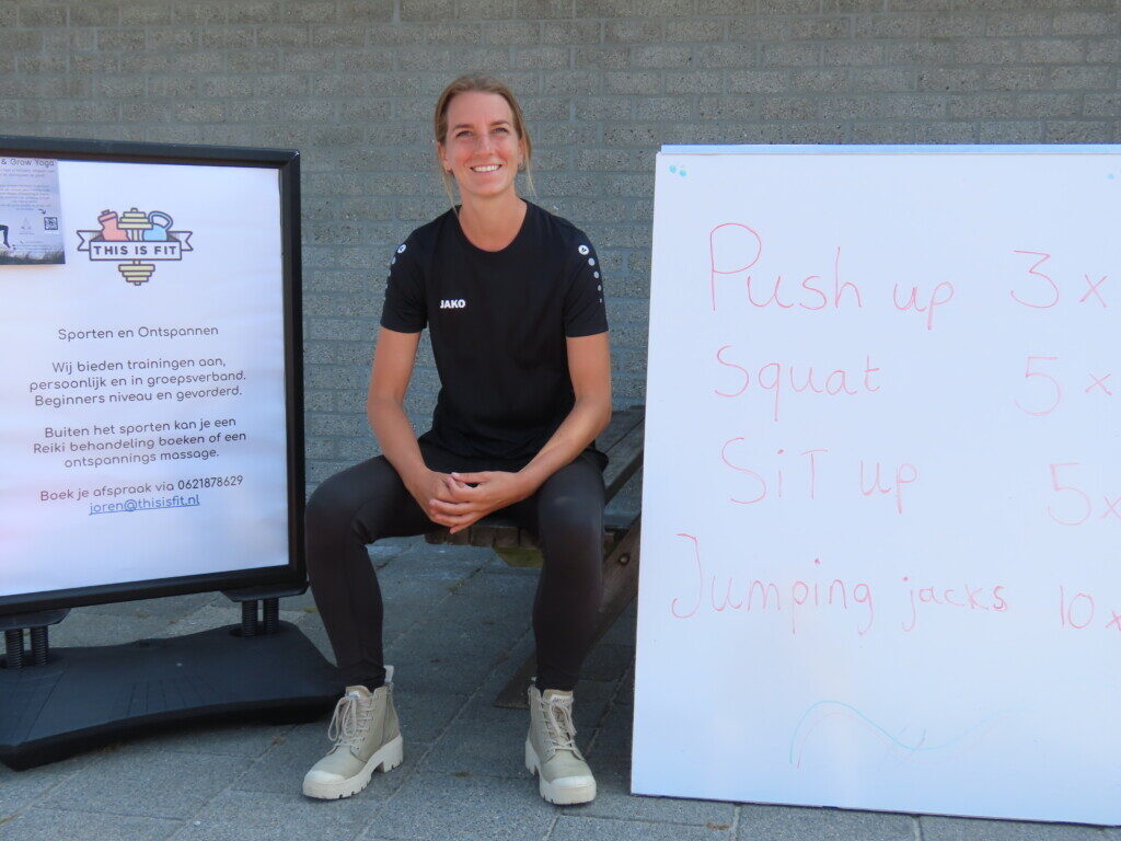 This is Fit-trainster Dominique met de onderdelen van het fitschaken: drie push-ups, vijf squats, vijf sit-ups en tien jumping jacks.