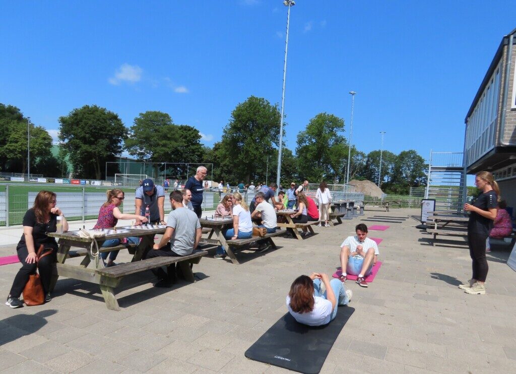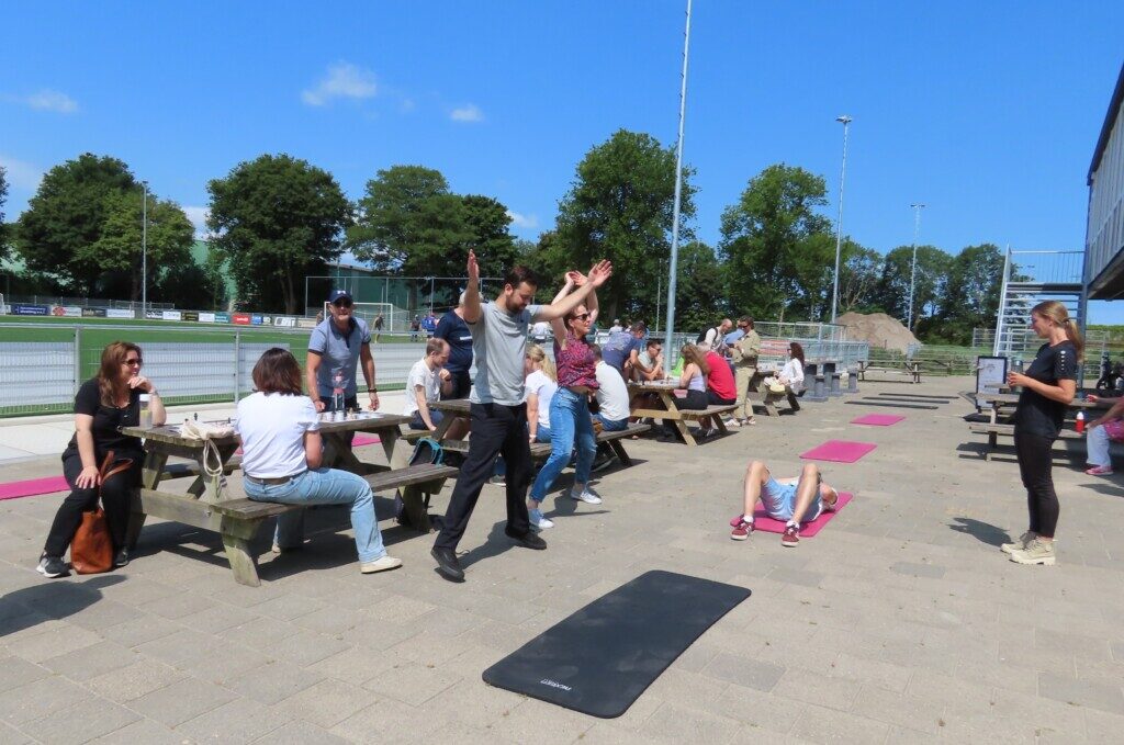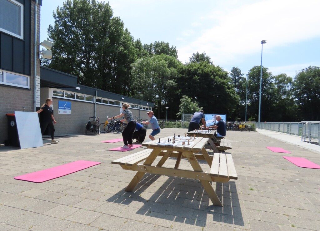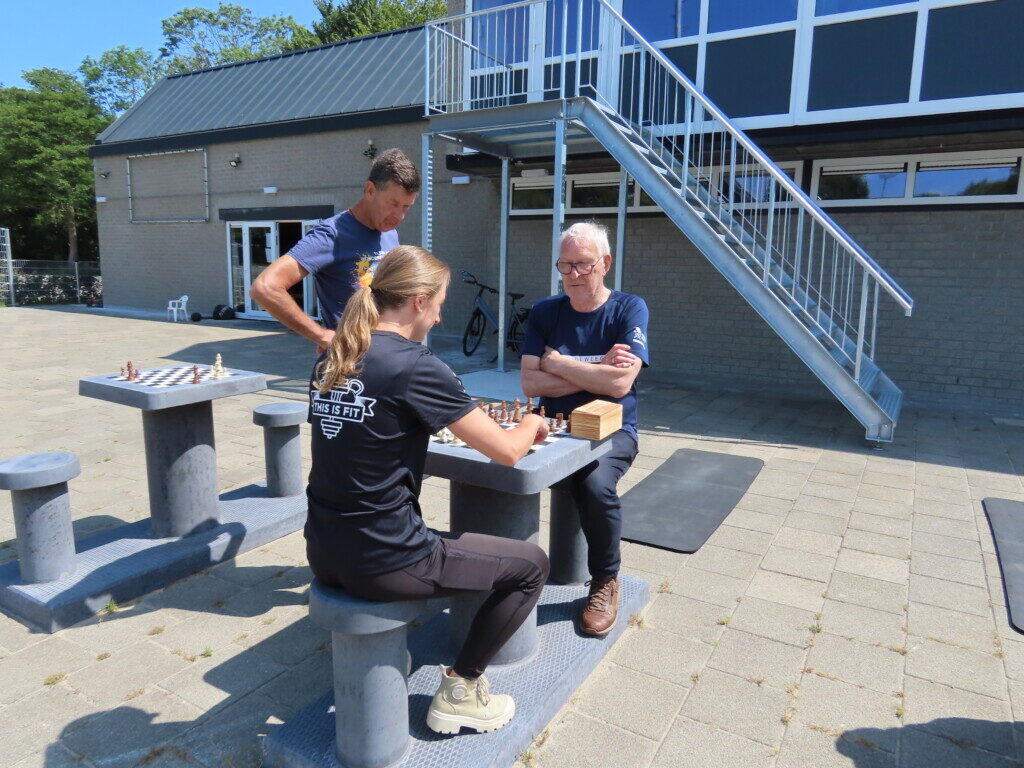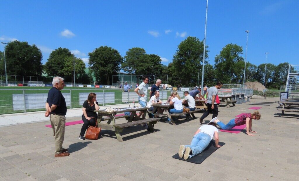 Tussen de zetten door stonden vier fitnessvormen van This is Fit-trainster Dominique centraal. De gemeentemedewerkers voerden push-ups, squats, sit-ups en jumping jacks uit en mochten daarna uitrusten aan het schaakbord om na een paar zetten de conditie met de volgende fitnessvorm te testen.