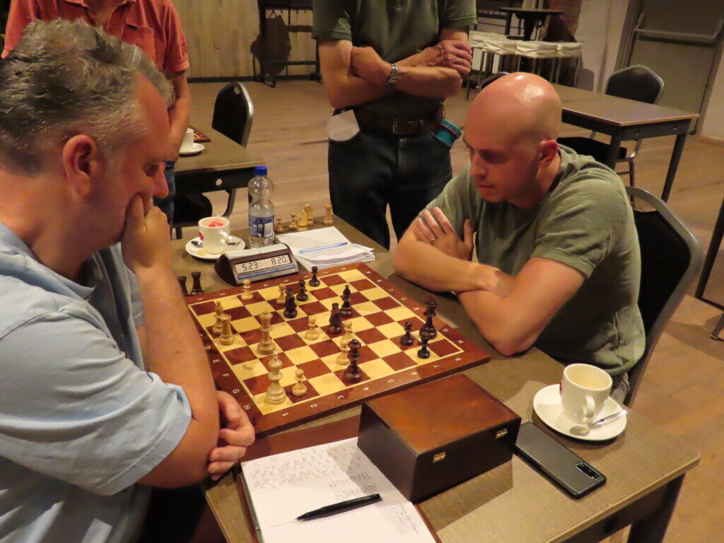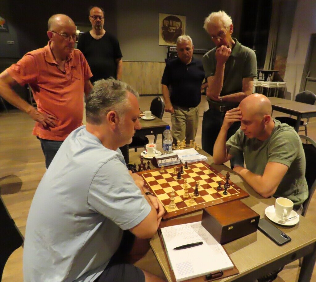 Acht uit dit gezelschap komen in actie tijdens de vijfde ronde van het Midzomertoernooi. Nizar Alayoubi is een van hen en hij zorgt met Remco Bravenboer voor een spektakelstuk. Nizar steekt met 18. … f5 het vuur aan. Die pion speelt meteen een dubbelrol. Als verdediger van een pion op e4 en hij staat in de penning van een toren op c8. Remco besluit het een en ander te combineren, maar daardoor raakt hij de kleine kwaliteit achter. Een voordeel voor de Wervershover is dat hij over het loperpaar beschikt, terwijl er steeds meer ruimte komt. Het bord staat in brand. Het fraaie 27. … Lh1 (matdreiging op g2) wordt kundig gepareerd met 28. e4. Beiden hebben een vrijpion: wit op b5, zwart op c5. Nizars 30. … Da7 lijkt een mindere zet, maar de gedachte er achter is interessant: zijn vrijpion kan twee velden opschuiven. In tijdnood van met name Remco blijft de amusementswaarde hoog en in een duidelijk mindere stelling is zijn 41. Df3 van hoog niveau. Zijn opponent is bezig om de slotaanval in te zetten en moet plotseling opletten dat hij niet mat gaat. Zwart houdt het hoofd koel en met minder dan een minuut op de klok voor de witspeler pakt Remco’s kwaliteitsoffer verkeerd uit. Hij verliest zijn laatste toren en het is uit.