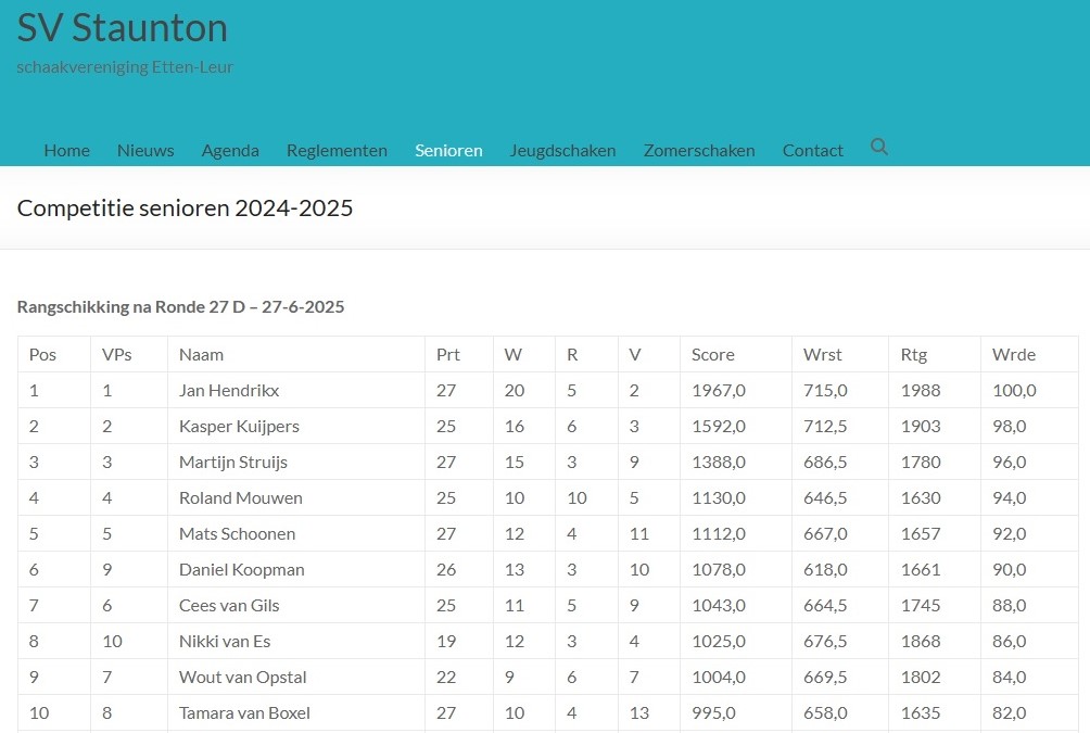 Afgelopen bondsseizoen werd Daniël Koopman met Mats Schoonen teamtopscorer van Staunton 2 in de zesde klasse L. Staunton? Is Daniël naar Groningen verhuisd? Nee, want er is ook in Etten-Leur – gelegen tussen Roosendaal en Breda – een schaakclub met die naam. De vereniging heeft een mooie website en daarop is te lezen dat hij in de clubcompetitie op de zesde plaats, in een veld met dertig deelnemers, is geëindigd. Of het komt door het lidmaatschap van Daniël is niet bekend, maar bij Staunton doen ze eveneens aan zomerschaak. Op acht vrijdagen in juli en augustus, met een speeltempo van dertig minuten en drie partijen op een avond.
