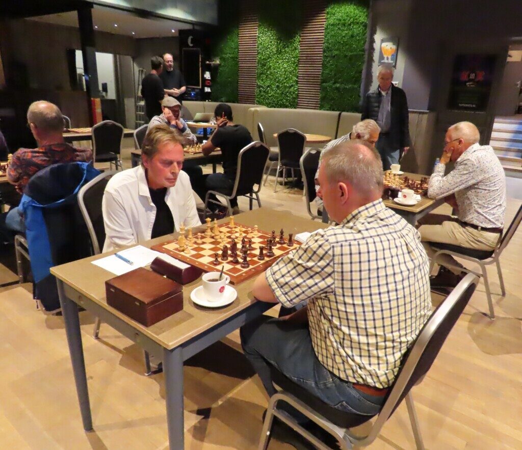 Caïssa 4 pakte het kampioenschap door zes wedstrijden te winnen en eenmaal gelijk te spelen. Dat gebeurde tegen Degoschalm. Daniël en ik – met zwart – deden het aanvankelijk voorzichtig aam en lieten vooral de paarden het werk doen. In de eerste twintig zetten sprongen wit acht en mijn ‘knollen’ zeven keer. Na langdurig gemanoeuvreer was de stelling gelijkwaardig. Zwart had zijn torens verdubbeld op de open b-lijn, Daniël op de tweede rij. Maar zijn dame stond ertussen en dat brak hem op. Met 38. Tb2 dacht hij aan een ruil, het werd toren- en partijverlies. Daarmee kwam de onderlinge score op 3-3.