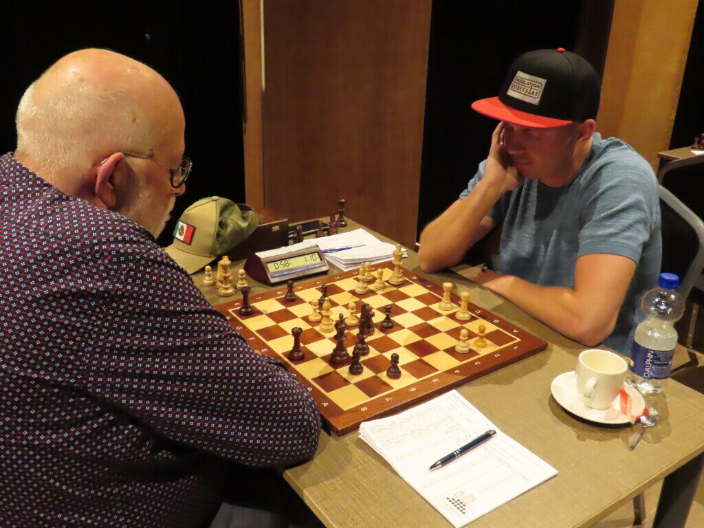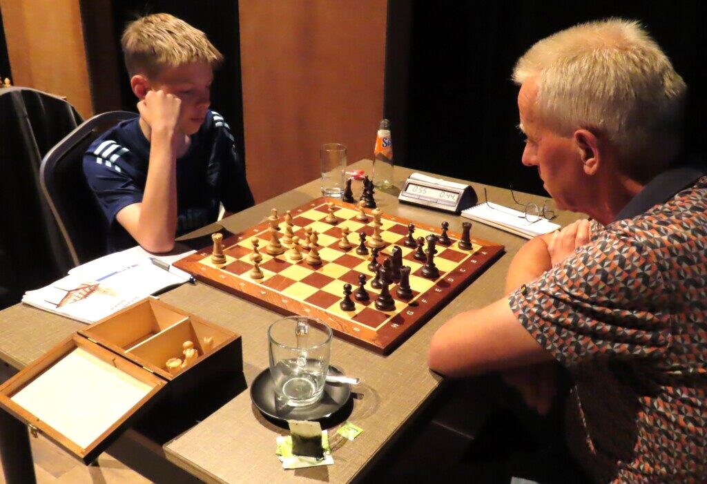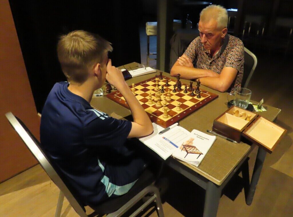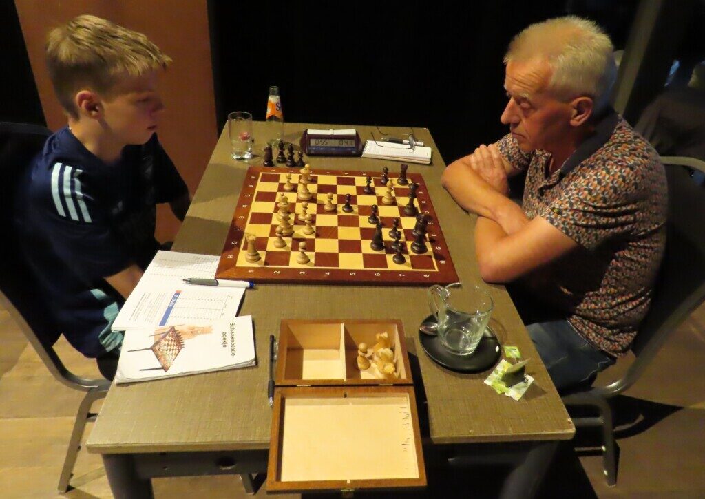 Het Midzomertoernooi trekt door de jaren heen veel bekenden en het lijkt me leuk om uit te zoeken hoeveel partijen ze in de loop der seizoenen in Vereenigingsgebouw De Tuf hebben gespeeld. Misschien kunnen we wel een Club van Honderd vormen: deelnemers met honderd en meer Bovenkarspelse partijen achter hun naam. Nico Reus, bezig aan zijn achtste toernooi, staat na de tiende ronde op 78 en kan eventueel in 2027 toetreden. Hij neemt het op tegen jeugdspeler Stef de Wit. Beiden hebben de afgelopen weken vier keer gewonnen en het lijkt erop dat er voor de secretaris van Degoschalm/Revanche een vijfde succes bij komt. Op de zevende zet ruilt hij een loper voor het b1-paard om meteen daarna met 8. … Lb4+ te forceren dat wit niet kan rokeren. Stef wil die mogelijkheid behouden, maar zijn ‘oplossing’ 9. Pe2 vormt de inleiding tot uiteindelijk torenverlies. Het talent van Torenhoog krijgt direct iets van een herkansing. Nico rokeert te snel en verzuimt zijn b4-loper in veiligheid te brengen. Zo verkleint wit de materiële achterstand tot de kwaliteit en een pion. Dankzij een actief loperpaar verovert hij de c7-pion en is de stelling gelijkwaardig geworden. En zelfs de kwaliteit wordt teruggewonnen. In een toreneindspel met een sterke witte loper contra een passief zwart paard probeert Nico de lichte stukken te ruilen. Zijn jonge opponent kan echter torenruil afdwingen en mag dan aan de winst gaan denken. Hij verovert een pion en als zwart met het paard naar een verkeerd veld springt (h4 in plaats van d6), gaat zijn laatste stuk verloren. Stef stelt daarna soepel, en met de matzet, zijn vijfde partijzege veilig.