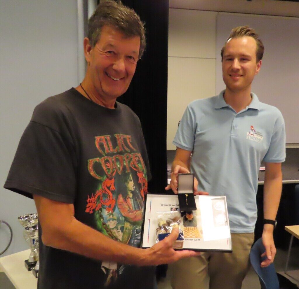 Namens de Koninklijke Nederlandse Schaakbond heeft Robbert van Dijkhuizen, voorzitter van Caïssa-Eenhoorn, de gouden KNSB-speld uitgereikt aan Arnold van der Wolff die van de club ook een oorkonde met foto en een presentje krijgt.