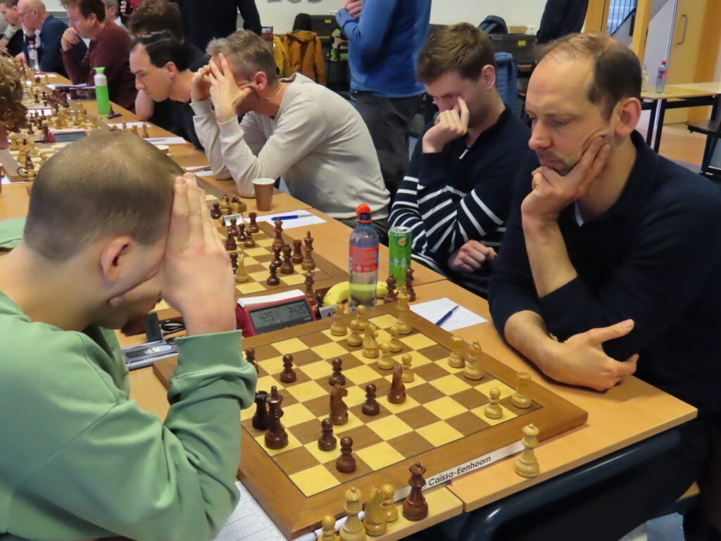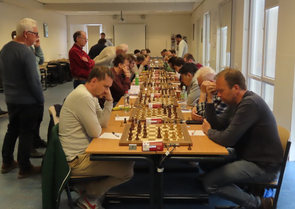 Net als in 2018 zitten Misha Dorokhin en Pieter Hopman tegenover elkaar aan het eerste bord. Acht jaar geleden ging het er in een Caro-Kann nog redelijk rustig aan toe en legde Misha met een tijdelijk kwaliteitsoffer de basis voor zijn zege, ditmaal is in dezelfde fase van de partij sprake van wildwestschaak. Beiden vechten om het initiatief en met 24. Dg5 lijkt Pieter twee troeven in handen te hebben. Hij valt een paard in het centrum aan alsmede een pion op h5. Vervolgens zindert het twintig zetten lang. Opeens blijkt in een onschuldig d-pionnetje van de Hoornse kopman heel veel gif te zitten en na 33. ... Te7 zijn er geen vluchtvelden meer voor de Purmerendse dame. Partij beslist? Het blijft uitkijken voor Misha. Met enkele schaakjes is de witte koning opgejaagd naar veld f4 en met Pieter aan zet is het mat in één. Maar Misha is aan zet en hij heeft, al hoofdschuddend, diep nagedacht. Zijn materiaal bezet de eerste en achtste rij en met name de dame en loper lijken buitenspel te staan. Slechts vier zetten zijn nodig om de samenwerking optimaal te maken en alle problemen op te lossen: 3-0.