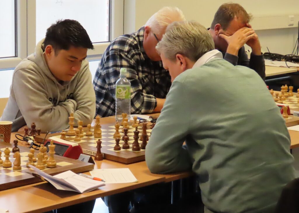 Veelvoudig NHSB-kampioen Hing Ting Lai, in meerdere disciplines, is al een aantal jaren lid van Purmerend. Toch speelt hij in deze slotronde pas zijn eerste partij tegen Caïssa-Eenhoorn. Hij treft in Henk-Jan Visser een opponent die tegenover veel groot- en internationaal meesters heeft gezeten en zo voor een mooi affiche zorgt. De twee zijn aan elkaar gewaagd. Na beider wat late rokade neemt Hing Ting de zwarte d5-pion op de korrel en die valt ook. In een fase met veel gemanoeuvreer worden de dames geruild en heeft wit een sterk paard in het centrum, dat Henk-Jans mogelijkheden enigszins beperkt. Zijn loper kan weinig kanten op; beiden beschikken voorts over de torens. Terwijl de druk op de damevleugel – waar Hing Ting een pion meer heeft – toeneemt, kiest zwart voor een kwaliteitsoffer dat geen oplossing biedt. Snel daarna beseft de Caïssa-Eenhoornaar dat de partij niet te redden is.