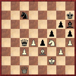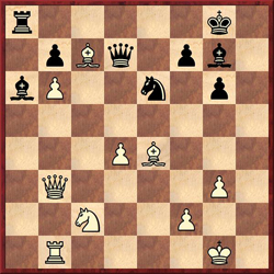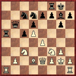 16....Da6?? Nou, nee. Na het correcte 16...Db5! zou zwart uitstekende zaken gedaan hebben, maar de tekstzet laat een kleinigheidje toe. Henk-Jan had het inmiddels zelf ook gezien en bleef doodstil zitten, enkele minuten in doodsangst verkerend. Waar wachtte wit op?