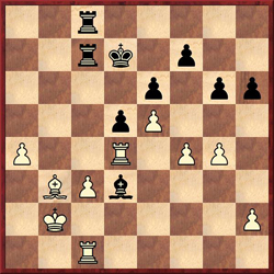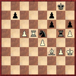 Tijdgebrek noopt mij tot bondigheid in dit verslag, laten we daarom snel naar de partijen kijken. Eerst maar eens twee relatief saaie remises wegwerken: Peter Doggers speelde met zwart een "niemendalletje" (zijn woorden) tegen Rik Salomons. Een KID/Benoni-achtige structuur waarin inderdaad het ene na het andere stuk geruild werd. Toch waren er ook hier best interessante momenten, zoals het onderstaande: