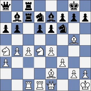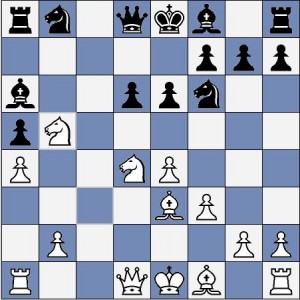 Wit heeft zojuist de druk verhoogd en zwart heeft weinig nuttige zetten. Misschien doet hij er beter aan om met Db8 en La8 de pion op b6 te dekken. De centrumactie van Ronald leverde direct een nul op: 20...d5?? Een bizarre zet, vooral omdat deze verliest op exd5, op cxd5 en op het gespeelde (en tevens de sterkste zet) 21.e5! en het paard kan niet weg.