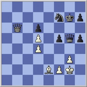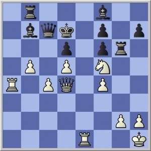 28.h4? In zwarts tijdnood een hele onaangename, maar objectief gezien is dit niet de beste zet. Winnend was 28.De4! met als fraaie hoofdvariant 28…Dc5 29.Pd4 Kc7 30.Pc6 Tc8 31.b6+! Dxb6 (31…Kxb6 32.Tb1+ gevolgd door Ta7) 32.De7+!! Lxe7 33.Txe7 mat!