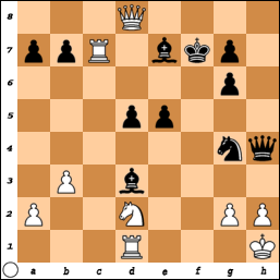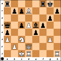 Zwart heeft een stuk geofferd voor vier pionnen maar die staan eerder in de weg dan dat ze zwart helpen. De coördinatie van de zwarte stukken is ver te zoeken. Le5 lijkt een grove fout. Waarschijnlijk in een poging om dekking van h7 mogelijk te maken. Nadeel is dat de veiligheid van de zwarte koning hier niet mee is geholpen. Zwart vervolgt zelfs met 23. ... h5.