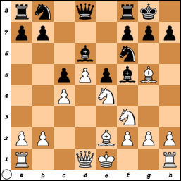 Zwart heeft de b5 pion volkomen weggeblunderd. Aanvankelijk lijkt de stelling hopeloos maar zwart heeft toch aanknopingspunten, de half open b lijn en een monster op de zwarte diagonalen. Slaan dreigt op h2 of c3. Wat wit noopt tot 16. Ld2? Overigens slaan op c3 werkt niet ivm dreiging op f7 na Pc4 en Pd6. Voor de volledige variant verwijs ik naar een redelijke schaak engine. Dus g3 had volstaan.