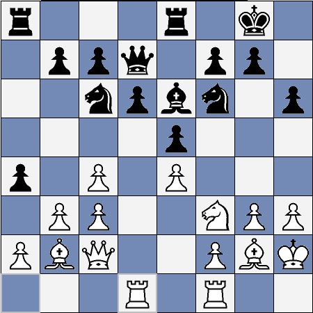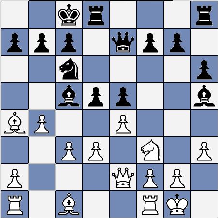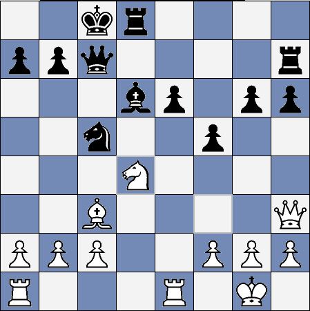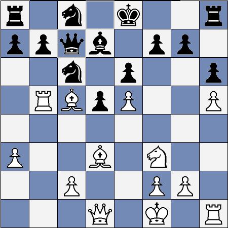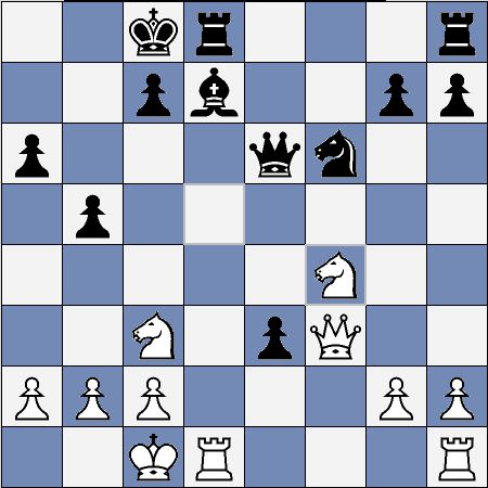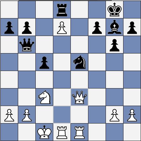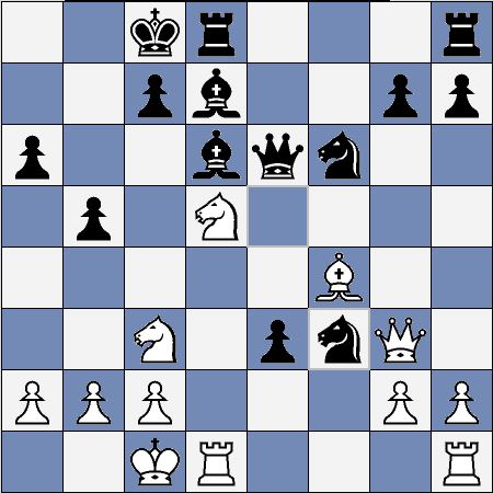 Zwart is in grote problemen omdat 15....Lb6 16.exd5 Txd5 17.Lxc6 bxc6 18.c4 niet gaat en is hier genoodzaakt een stuk te geven. 15....Lxb4 16.cxb4 Pd4 16.Db2? 16.De3 houdt de f-pion en moet genoeg zijn voor de winst, nu ontsnapte zwart na 16....Lxf3 17.gxf3 Pxf3+ 18.Kg2 Ph4+ 19.Kh2 Pf3+ 20.Kg2 0.5-0.5