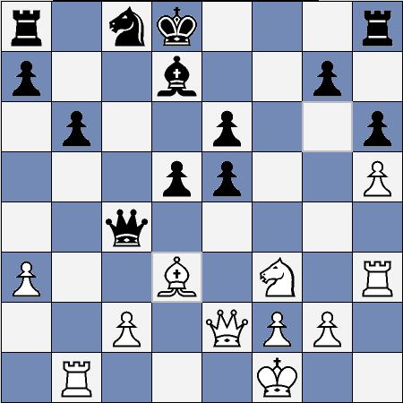 Wit dreigt zowel Pxe6 als Pb5 en na de logische verdediging 20....Dd7 is het een gelijke maar scherpe stelling. Joseph besluit doodleuk om Pb5 niet als dreiging te ervaren. 20....Te8? 21.Pb5 Db6 22.Pxd6 Dxd6 23.Le5 Dc6 24.Tad1 Td8