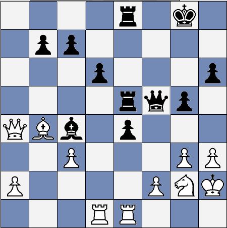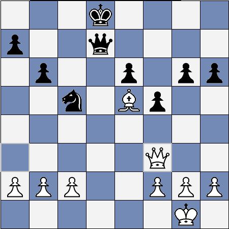 Wit heeft zojuist een fraaie geproduceerd die gelijk afgestraft had kunnen worden met 29....Dd2! 30.Lf6+ (30.Da8+? Ke7 31.Dxa7+ Pd7-+) Ke8 31.h3 Pe4 =+ 29...Pe4? 30.Dd3?? Een bijzonder fraaie afwikkeling die direct verliest. 30....Dxd3 31.cxd3 Pc5 32.d4 Pd3 Zwart wint een pion en het eindspel is heel eenvoudig gewonnen. 0-1