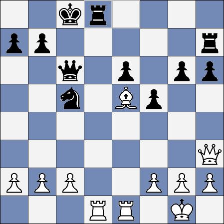 Zwart heeft de keuze uit Dc6 en Db6. Na 22....Db6 23.Pcd5 Pxd5 24.Pxd5 Db7 25.Dxe3 is het gelijk, maar in tijdnood krijgt het optisch aantrekkelijkere 22....Dc6? de voorkeur. 23.Txd7! Daar is ie dan. 23....Kxd7 24.Td1+ 1-0