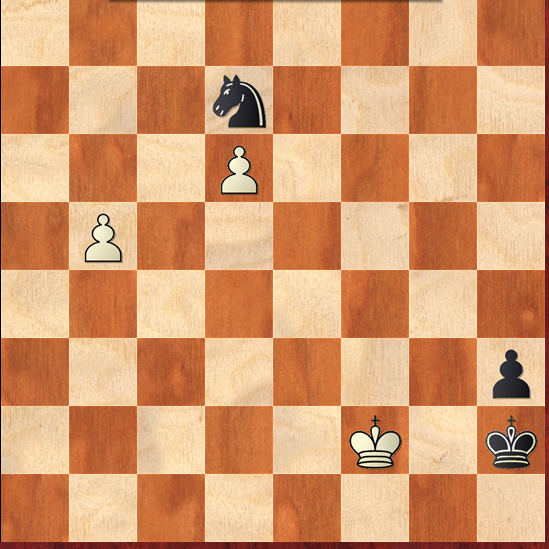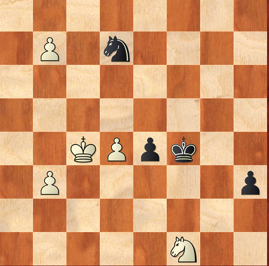 Na 67.Kd3 Kf3 speelde Niels 68.b4?. Oei, dat was minder en eigenlijk meteen ook de beslissende fout van Niels. Ph2+ is om dezelfde reden als de variant hiervoor genoemd voldoende om remise te houden. Nu krijgt zwart de gelegenheid om zijn paard erbij te halen wat Haver uiterst handig doet. 68….e2 69.Ph2+ Kg3 (het witte paard kan niet meer naar f1) 70.Kxe2 Kxh3 71.Kf2 Pd7. Het paard gaat beide pionnen in bedwang houden om de koning in zetdwang te brengen. 72.b5 Pb6 73.d6 Pd7