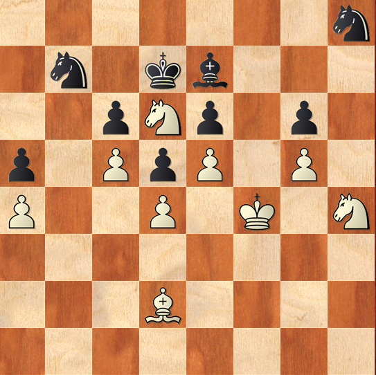 3½-2½ de voorsprong met nog twee borden in volle gang. Spanning volop dus! Piet Aardenburg speelde tegen de secretaris van de NHSB Özden Tuna. Beide spelers schoven de stelling dicht waarbij Piet wel wat meer ruimte tot zijn beschikking had. Nadat de b-lijn werd geopend werden de torens en dames geruild. Een remiseachtig lijkend eindspel met twee paarden en een gelijke loper voor beide bleef over. Piet heeft echter nog steeds meer ruimte en probeerde rustig op zoek te gaan naar een winstplan. Na wat gemanoeuvreer komt de volgende stelling op het bord: