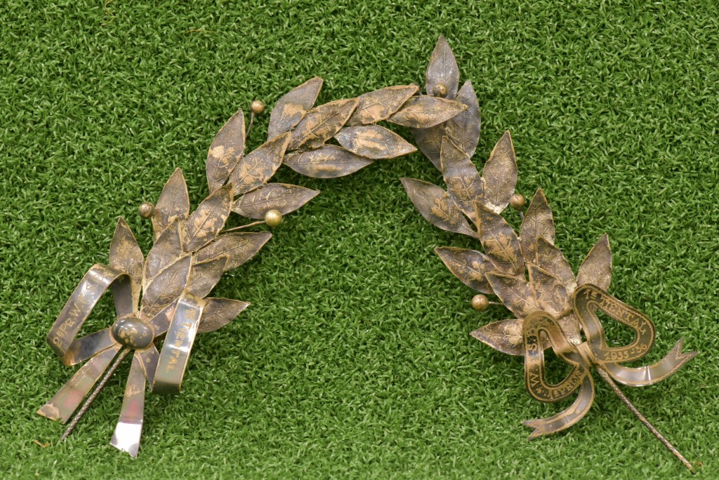 Op de lauwertak rechts staat onderaan vermeld: 'WFSB 1e prijs 1e TIENTAL 1935-'36'. De lauwertak links heeft Caïssa gewonnen dankzij de tweede plaats een seizoen eerder.