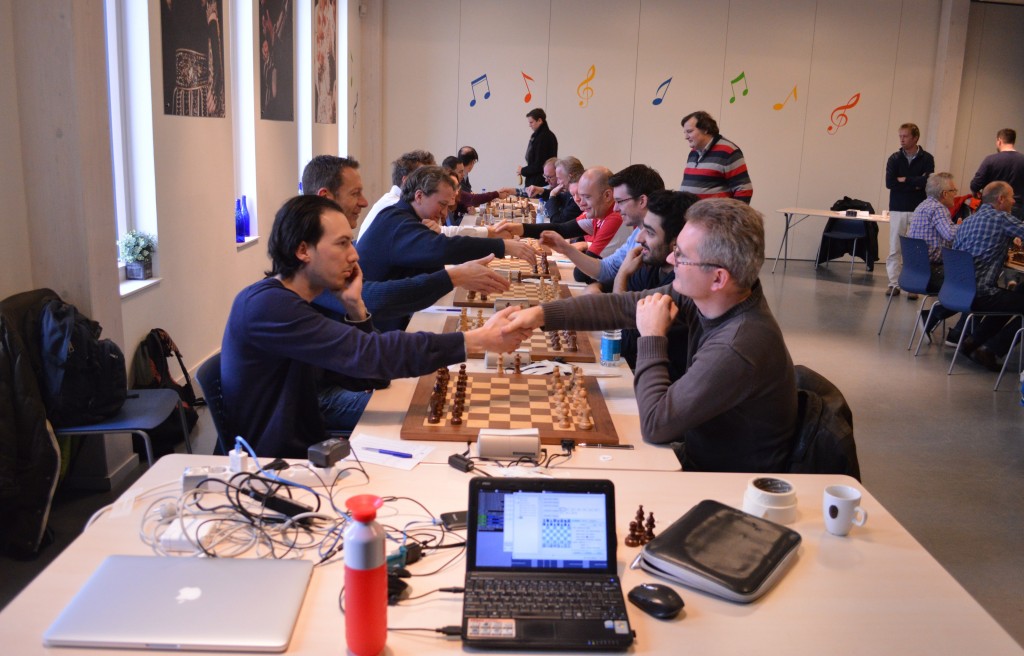 Caïssa-Eenhoorn - SG Max Euwe gaat van start. Op de voorgrond de respectievelijke kopmannen Martijn Monteban (links) en Frank Kroeze.