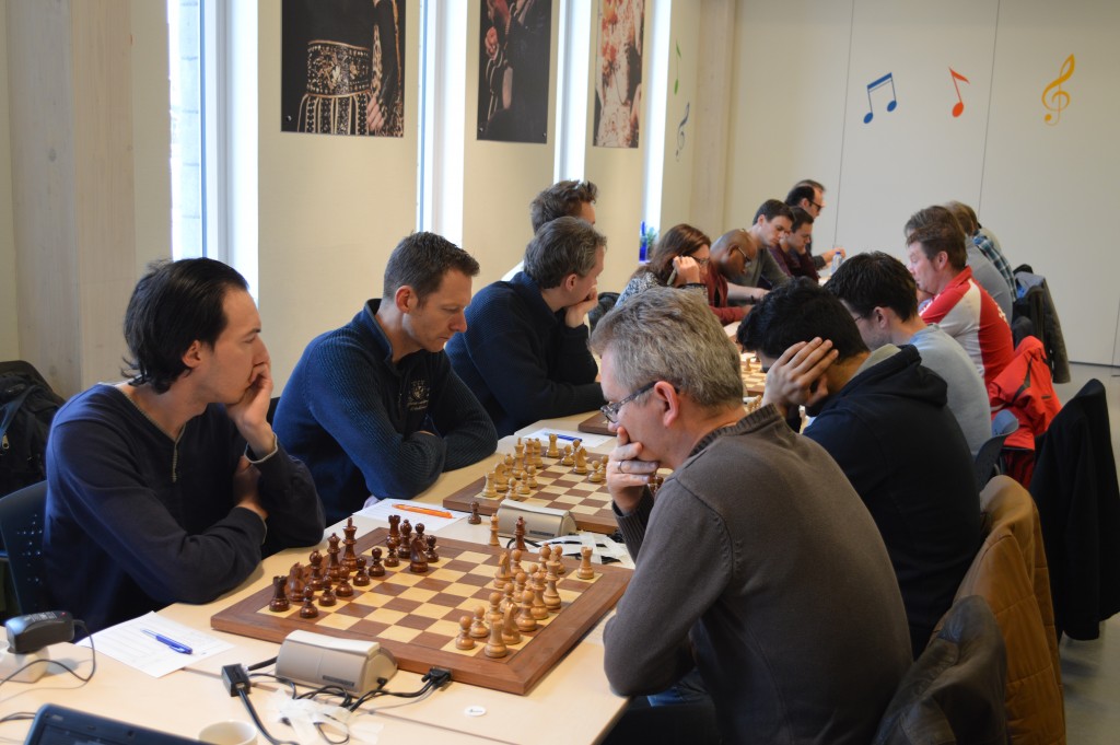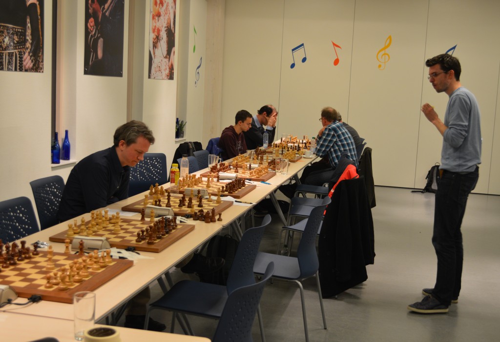 De strijd is in volle hevigheid aan de gang. Ron Deen (tweede van links) zal Caïssa-Eenhoorn aan een eerste voorsprong helpen.