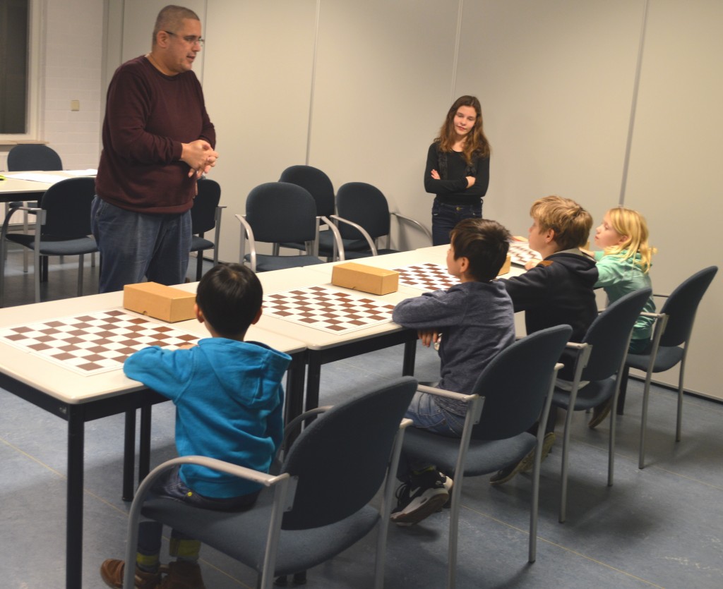 Ronald Ritsema heette vier jeugdsportpasdeelnemers die voor het schaken hadden gekozen, welkom. Omdat hij bovendien les gaf aan een van de vaste groepen, vroeg Caïssa-Eenhoorns clubkampioen Robin Duson mee te helpen met de jeugdsportpasschakers. Nick Manshanden assisteerde bij de Stap 3-jeugd.
