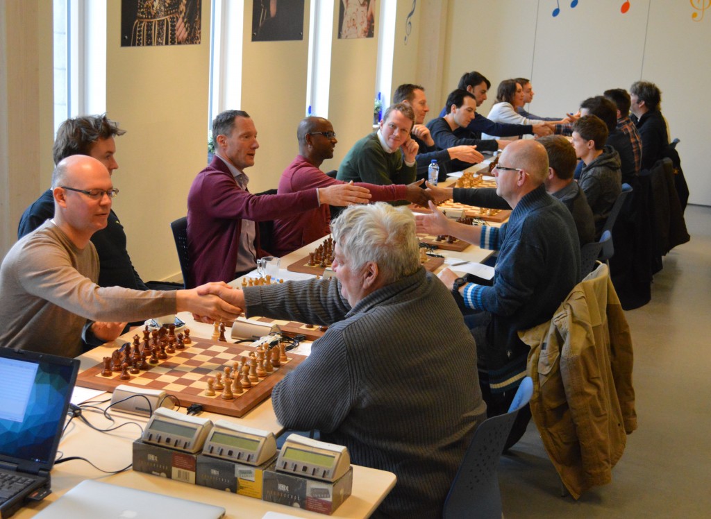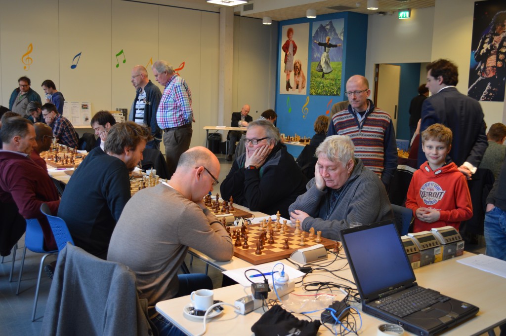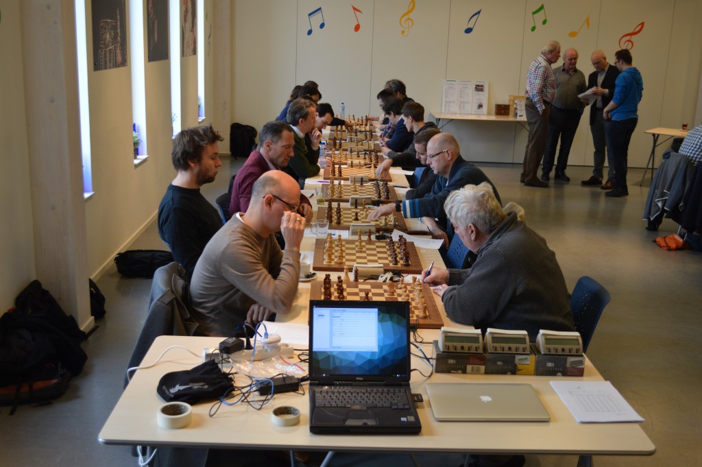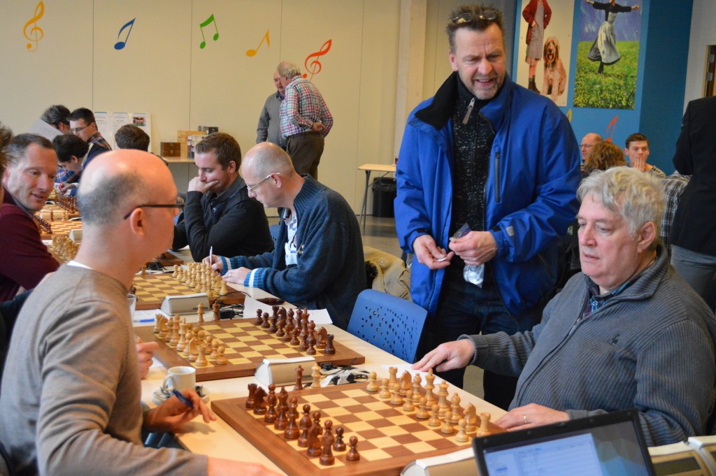 Het is deze zaterdagmiddag druk in de speelzaal van Caïssa-Eenhoorn. Aan de lange tafel bij de ramen moet het eerste tiental weer vol aan de bak om zijn positie in de landelijke eerste klasse A te verbeteren. Caïssa-Eenhoorn 2 staat in 3B in de bovenste regionen en heeft andere belangen. Diverse clubgenoten komen langs om de strijd op de achttien borden te volgen.