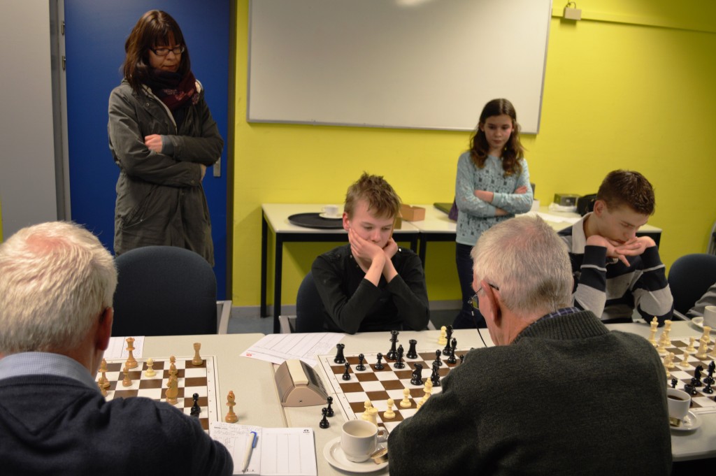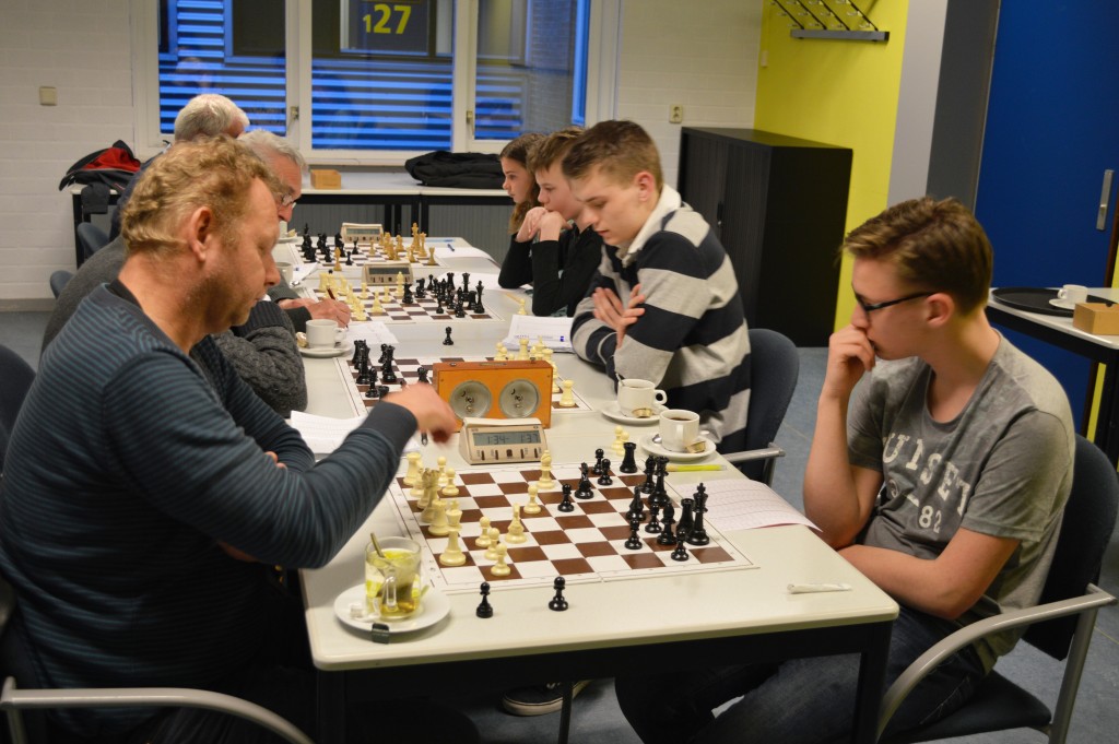 De Groene Zes - Caïssa-Eenhoorn is begonnen. Op de voorgrond is Eugène Koomen aan zet tegen Martijn de Wit.