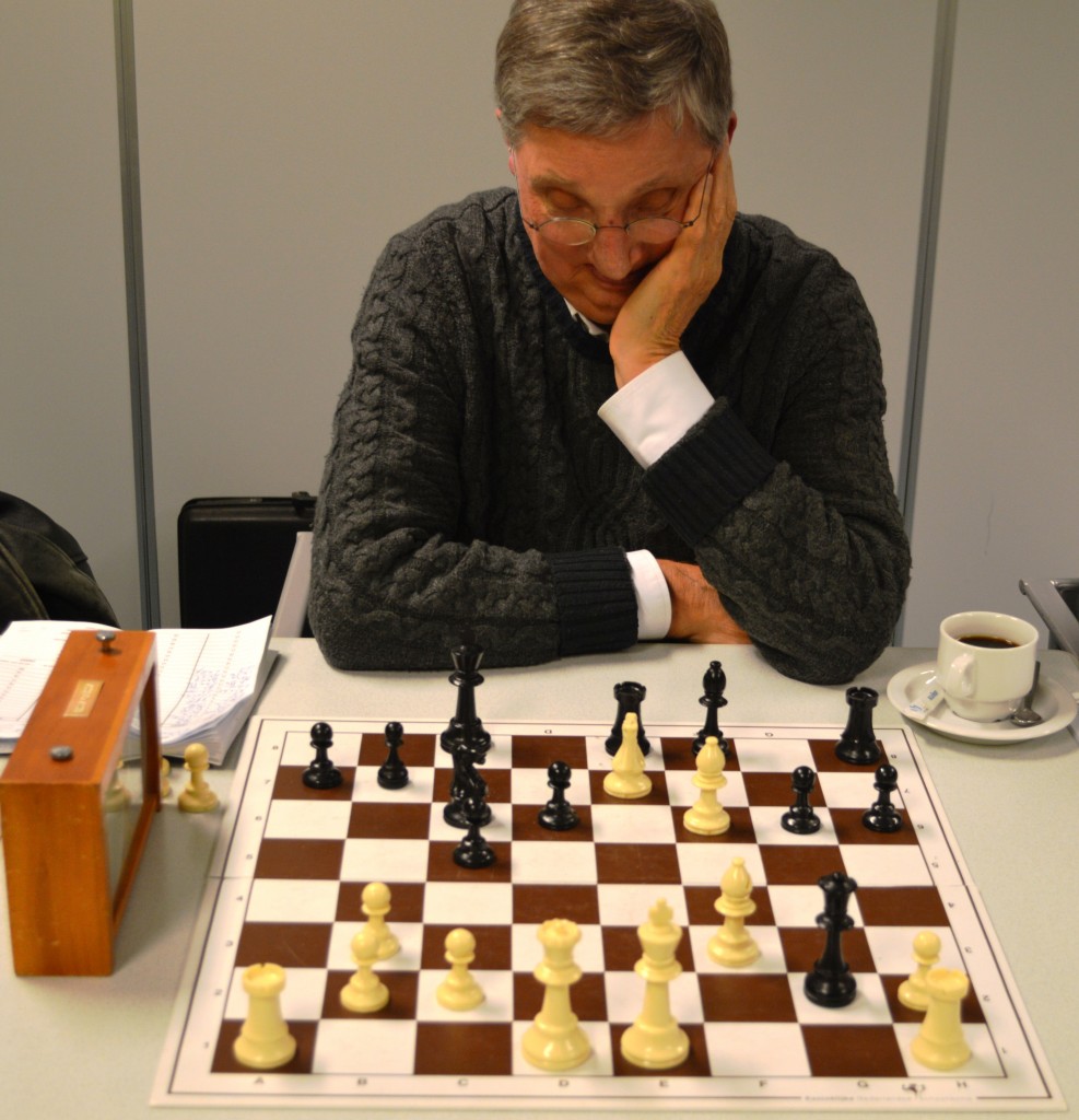 Mooie stelling. Kees Kraijo heeft schaak gegeven op e8, maar moet nadenken over een tegenschaak van het paard op e7. Nick Manshanden zal de dame op g2 veroveren.